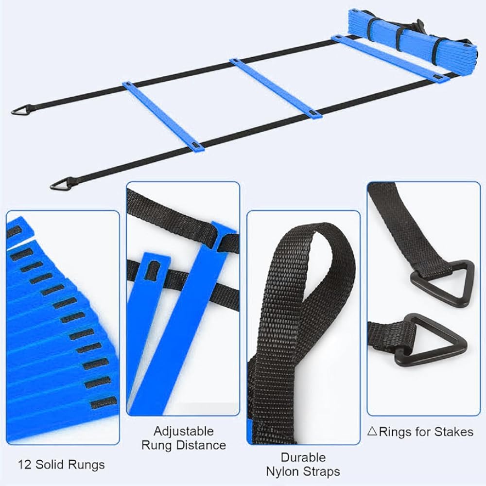 مجموعة تدريب سلم الرشاقة لألعاب كرة القدم، والتدريب على السرعة، ومظلة المقاومة للقدرة على التحمل، وتمارين القوة، و12 مخروطًا على شكل قرص، و4 أوتاد فولاذية، و5 قطع من أشرطة المقاومة، وحبل نط واحد. (أزرق)