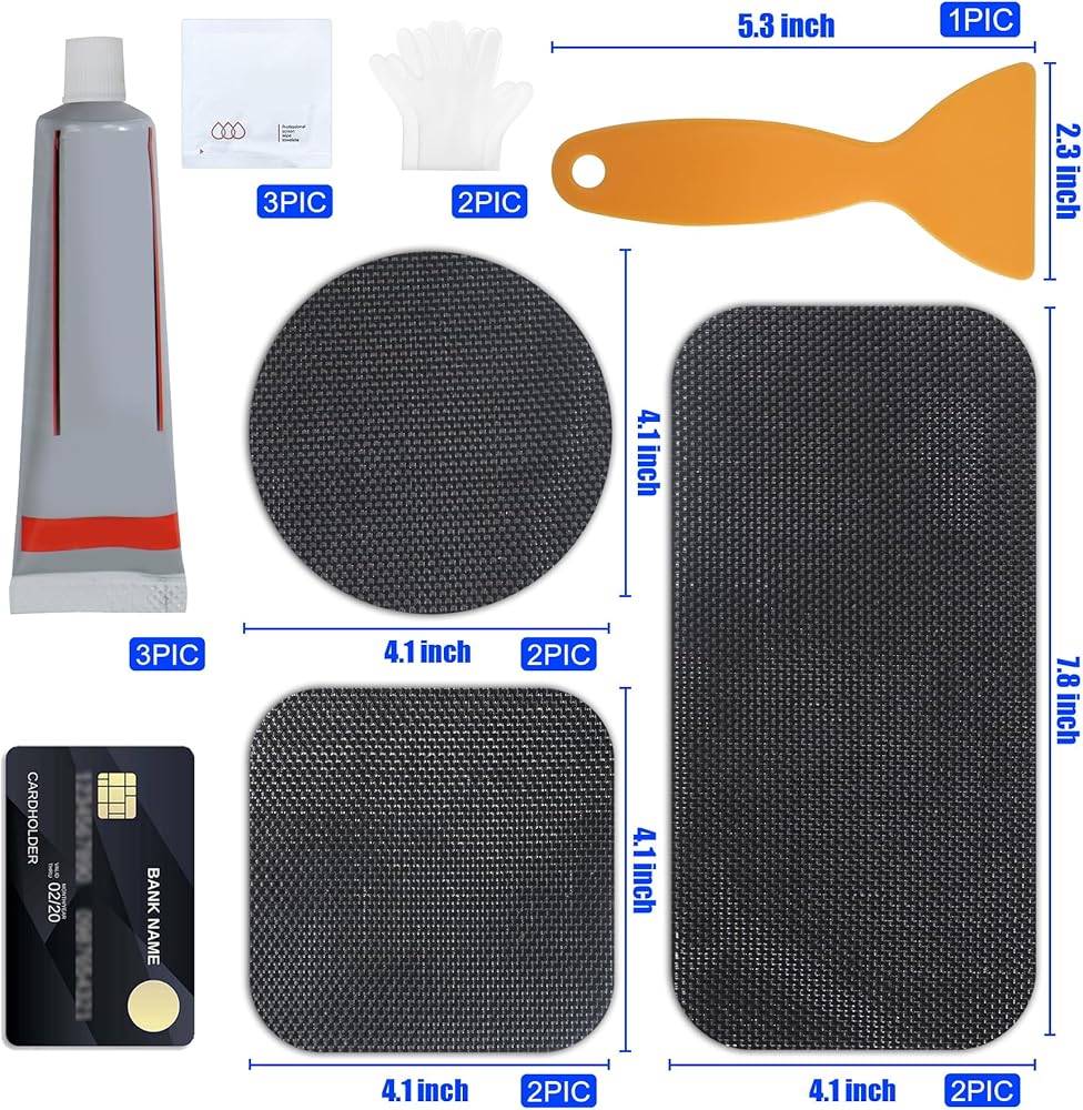 A Trampoline Repair Kit with all of the essential tools and materials you will need to perform the repair yourself. Instead of buying a trampoline replacement mat, consider this first! Square: comes with enough supplies to patch 1 hole. The Repair: it is recommended that the repair be done in an environment between [70F / 21C] and [90F / 32C]. The adhesive is not as easy to spread at a temperature lower than 70F. Higher than 90F and the mat may be too hot for the glue to cure fast enough to properly stick to the mat. The repair takes roughly 20 minutes to complete. This product is not designed for any tear or hole that is larger than 3 inches. Can be used on any shape of large or mini trampoline mats. The Patch: The square trampoline patches have rounded corners, avoiding the risk of them ca