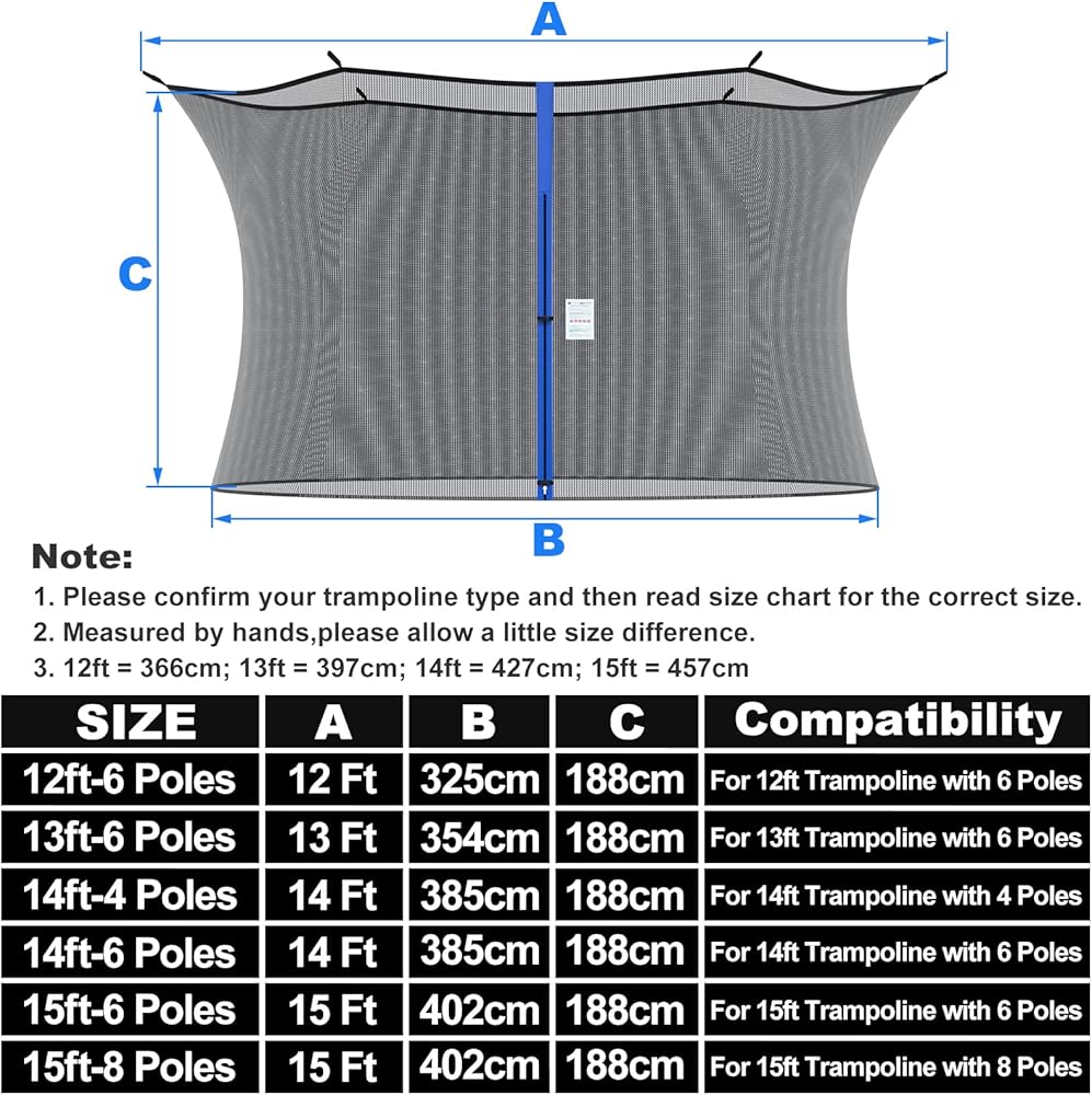تأكد من مقاسك - تأتي شبكات أمان الترامبولين المنسوجة بإحكام بأحجام مختلفة، يرجى التأكد من حجم الترامبولين والأعمدة قبل الشراء.