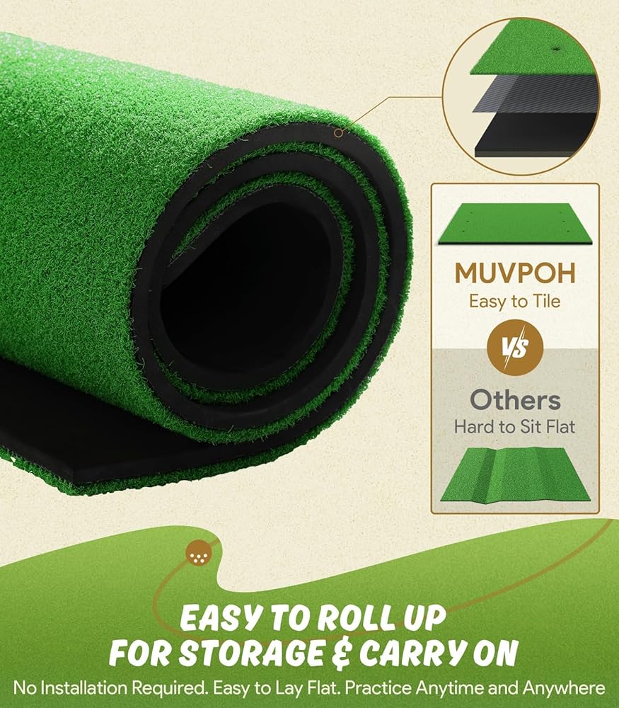 【⛳قاعدة EVA عالية المرونة غير قابلة للانزلاق】تستخدم سجادة عشب الجولف MUVPOH طبقة صناعية مضادة للتمزق لتحسين قوتها ومتانتها لضمان مقاومة التمزق والاستخدام طويل الأمد. يمتص التصميم المبطن بشكل جيد الصدمات، ويحمي المرفقين والمعصمين والكتفين أثناء ممارسة التأرجح والحديد والخشب والإسفين.
