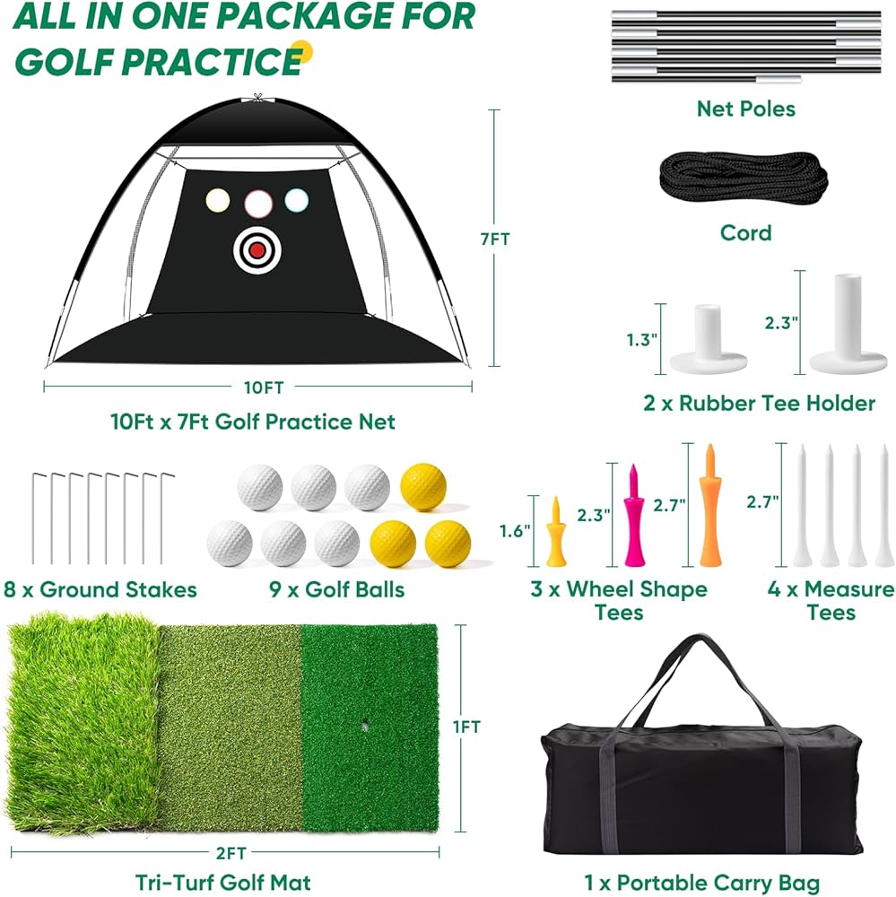 شبكة جولف OYN، شبكة تدريب جولف متينة مقاس 10 × 7 أقدام للقيادة في الفناء الخلفي والجراج - شبكة ضرب جولف الكل في 1 مع حصيرة جولف، 9 كرات جولف، 9 تي شيرت جولف، وحقيبة حمل للتدريب