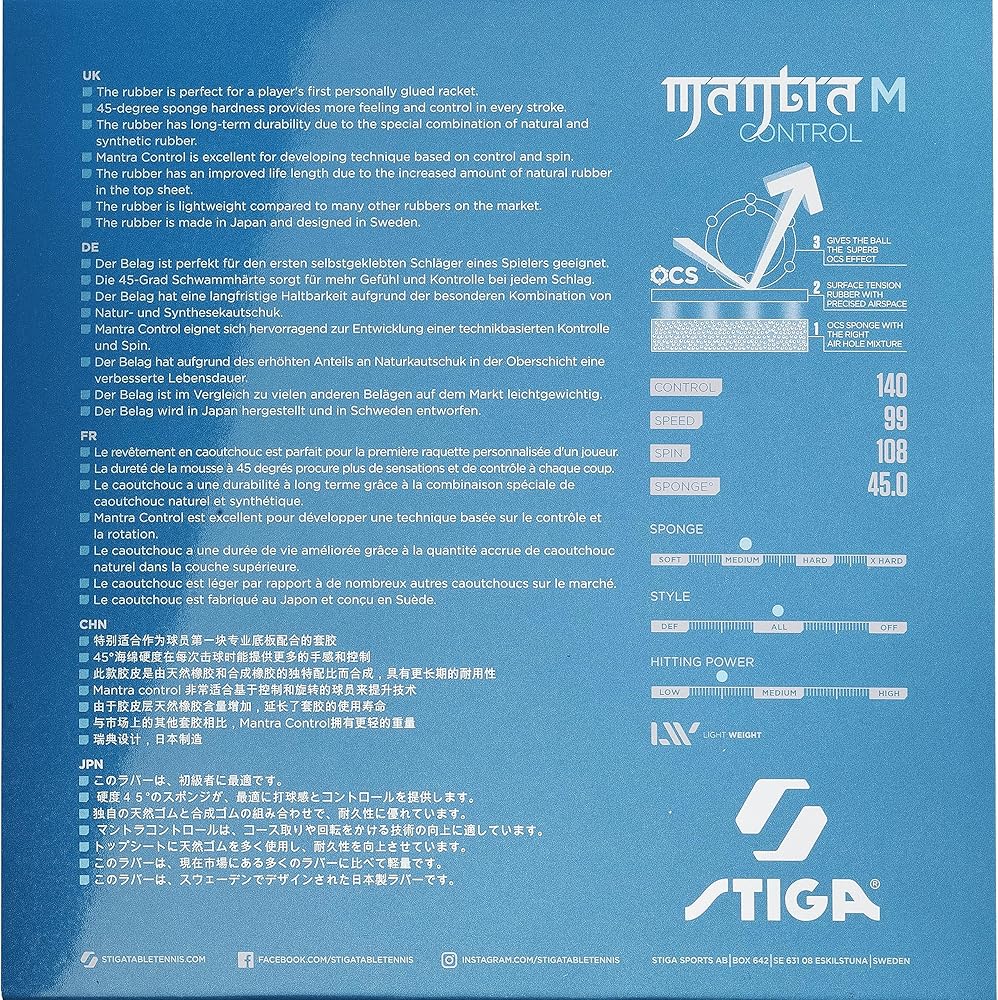 Mantra Control is the ultimate choice to take your game to the next level with precision and performance. The pad is especially suitable for those who want to stick their table tennis bat themselves for the first time. Due to the higher percentage of natural rubber in the surface layer, the mantra has a longer life, which allows you to play with it for longer. Perfect if you're working on your technique while maintaining control and spin. This topping allows you to control the game with controlled shots, refining your technique and playing style. The Mantra Control is also an incredibly lightweight surface that makes it easy to play with. This covering is developed in Sweden and made in Japan. Take your game to the next level today with even more control and better spin!