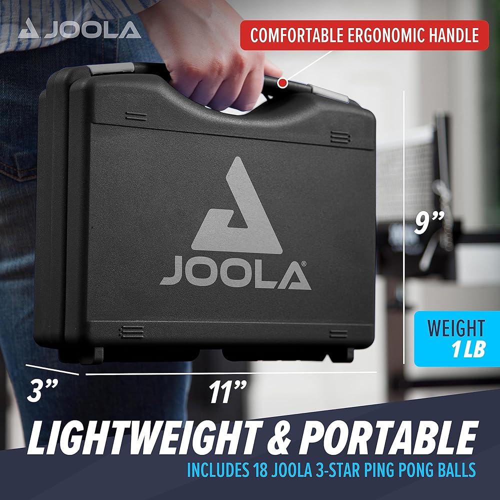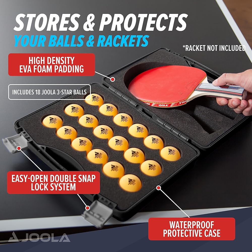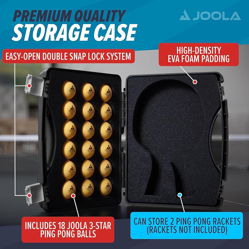 حقيبة تخزين محمولة: هذه الحقيبة الواقية المتينة عالية الكثافة والمبطنة بإسفنج EVA تخزن ما يصل إلى 18 كرة (متضمنة) ومجاديف تنس طاولة (غير متضمنة). يتميز بنظام قفل مزدوج سهل الفتح للحفاظ على المحتويات آمنة ونظيفة وجافة.