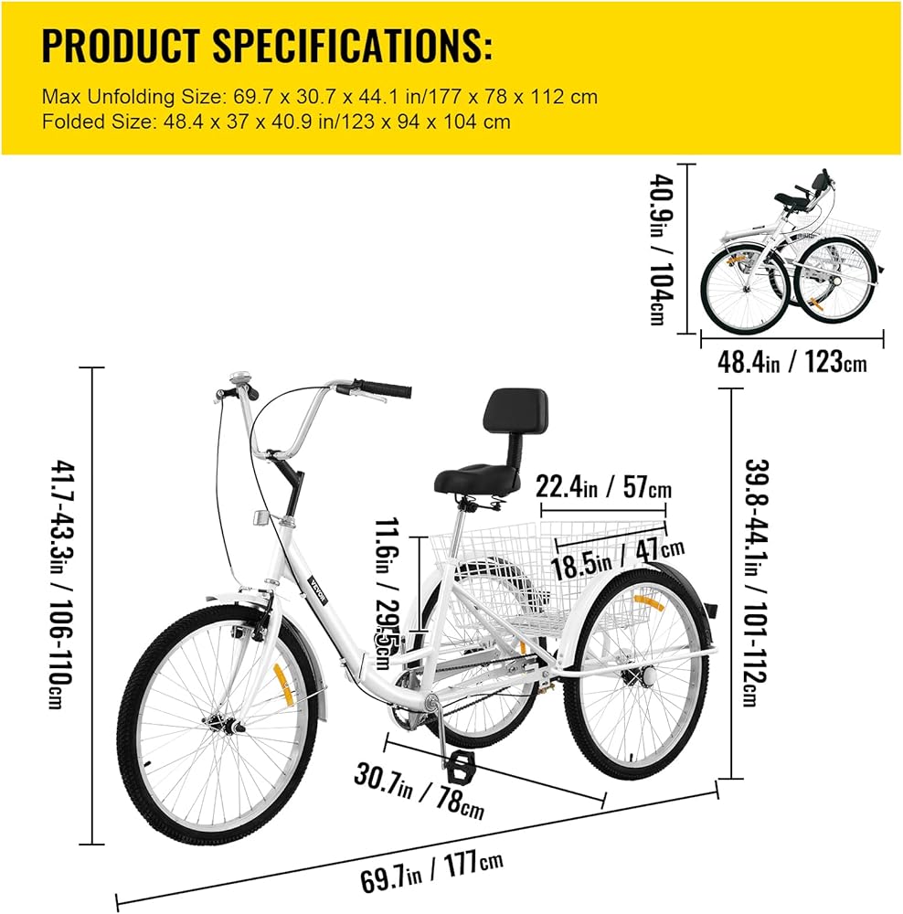 Unique Folding Design: Folded Size (L x W x H): 48.4" x 37" x 40.9"/123 x 94 x 104 cm. Thanks to a quick-release buckle, our adult tricycle can be easily folded in half. This foldable design allows easy transportation, space-saving storage, and convenient parking. When folded, the 3 wheel bike for adults will fit perfectly in your truck or SUV.