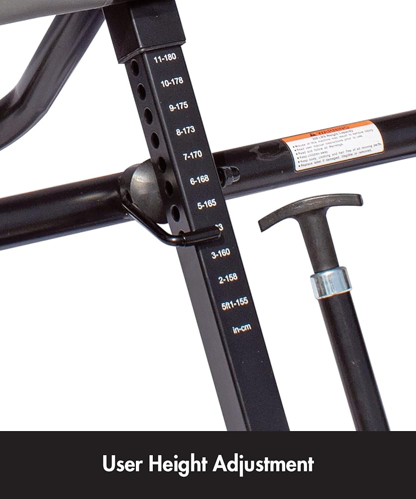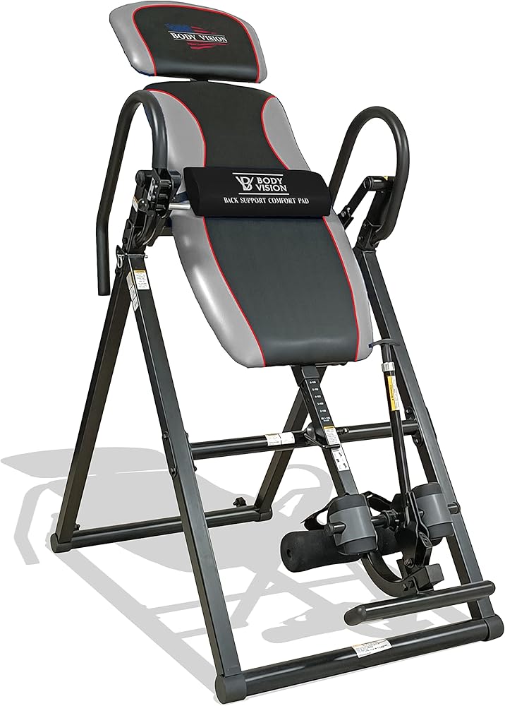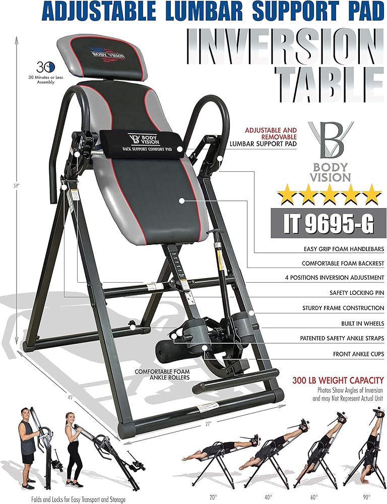 Body Vision IT 9695-G Deluxe Heavy Duty Therapeutic Inversion Table with Adjustable Head Rest Body Vision ITX 9688-W Deluxe Heavy Duty Therapeutic Inversion table combines all the benefits of inversion therapy with the best of comfort and safety. The heavy-duty frame design, comfortable large back pad, and patented safety features ensure a premium inversion experience. This Inversion table relieves back pressure, stress, and tension. Inversion Therapy decreases the negative effects of gravity by decompressing the spine which relieves back pain, improves posture, and increases flexibility in just minutes a day. The adjustable headrest and height selector ensures the ultimate comfort while the patented ankle security system provides the best in safety and security. This model Includes rear rolling wheels and a patented locking frame design. Disclaimer: Inversion tables are intended to provide back pain relief; however, they may not work for all customers, the purchase of this product does not guarantee pain relief. Safety Information: Always consult with a licensed physician before using any inversion table. Some medical conditions may not be suitable for use with this product. Disclaimer: Although we try to provide all product details and information accurately, there may manufacturing variations. You must always read all information on actual product packaging and materials included. There may be different information than presented on the product page or website. Please always check packaging, warning labels and instruction manual prior to using product. For additional product information or instruction please contact manufacturer.