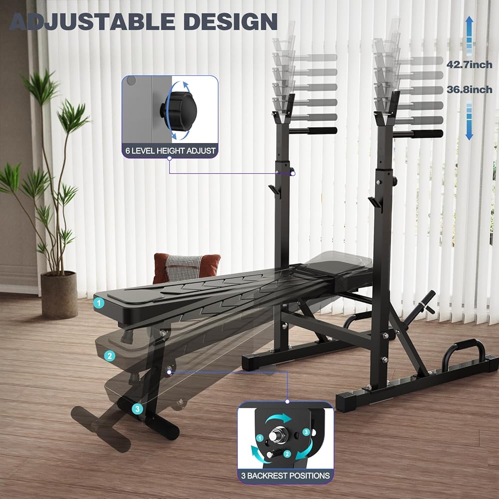 【مجموعة ارتفاع قابلة للتعديل】 يمكن تعديل رف الجرس إلى 6 مستويات مختلفة حتى تتمكن من اختيار ارتفاع قضيب الجرس لتسهيل الوصول إليه. بالإضافة إلى ذلك، مع 3 أوضاع لمسند الظهر قابلة للتعديل، يمكن أن يسمح لك جهاز ضغط المقعد هذا المزود بحامل بالتمرين في أوضاع وكثافات متعددة، مما يوفر لك خيارات إضافية للياقة البدنية.