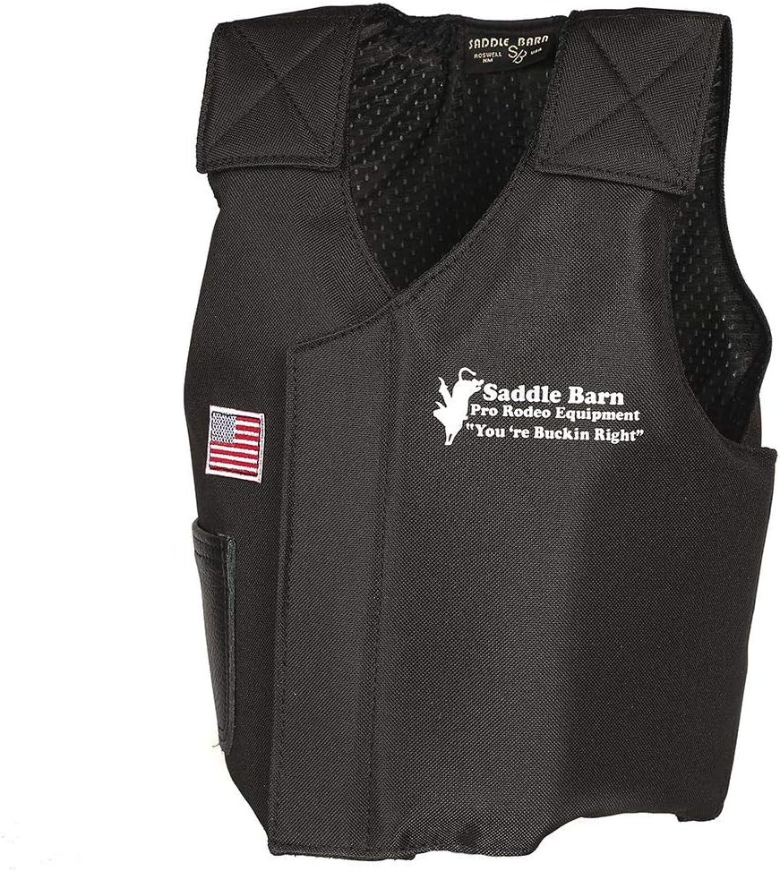 Saddle Barn600 Denier Cordora outershellVelcro adjustments for sizingPerfect for mutton bustersHigh Density FoamHas logo's and patchesColor: BlackMax Chest: 33"Max Abdomen: 28"SB10-52Just right for mutton busters. This durable vest is made from 600 denier cordura outershell and high density foam. with Velcro adjustments. Black with logo's and patches.