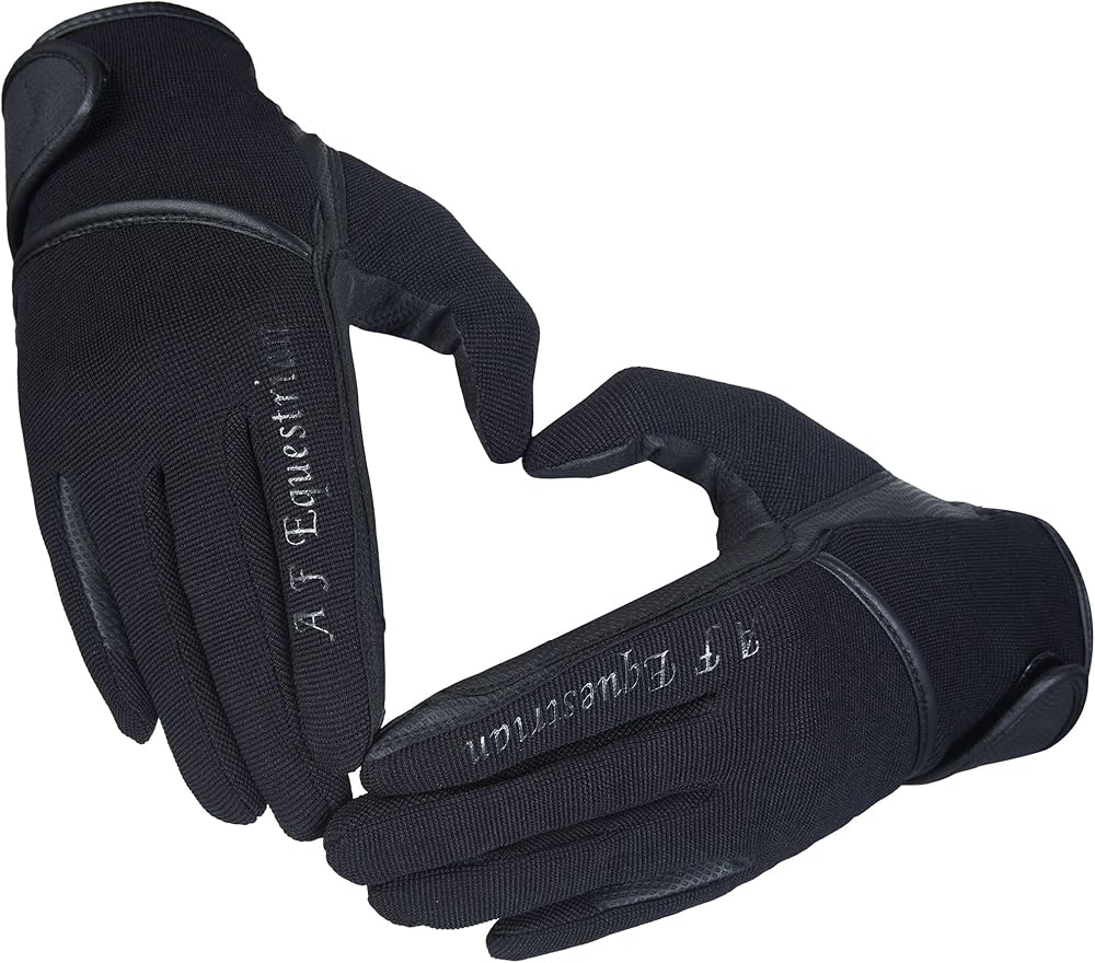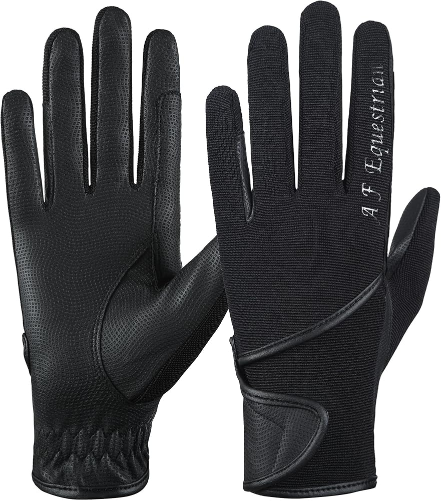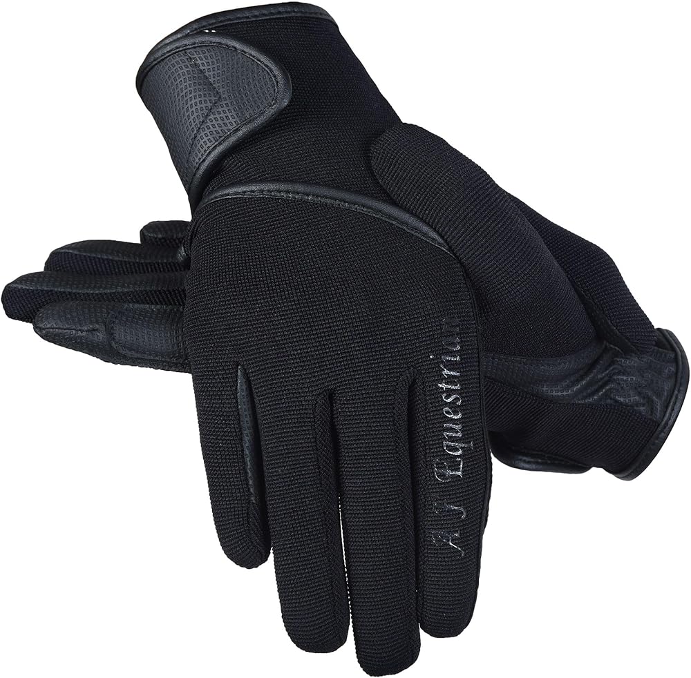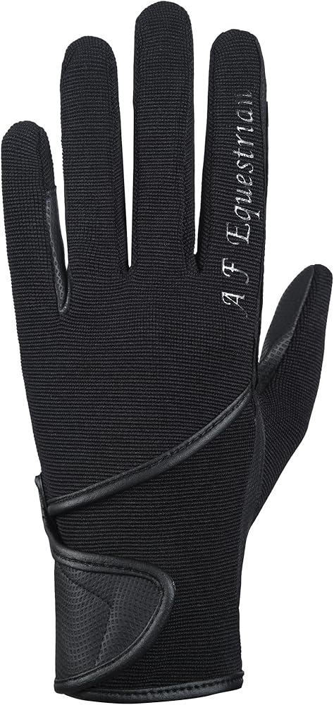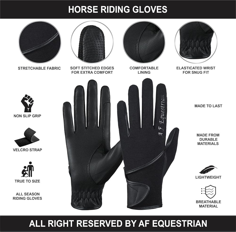 • 1 PAIR OF HIGH QUALITY SYNTHETIC LEATHER/COTTON HORSE RIDING GLOVES We are proud to present these high quality gloves which are made from synthetic leather at the palms for high sensitivity and grip and a cotton stretch back for maximum breathability and flexibility. Ideal for hard working hands! Reinforced stress points and a non-snag Velcro closure enhances durability. The articulated fingers provide a smooth fit with no bulk. * Lightweight and comfortable * Flexible stretch material * Durable