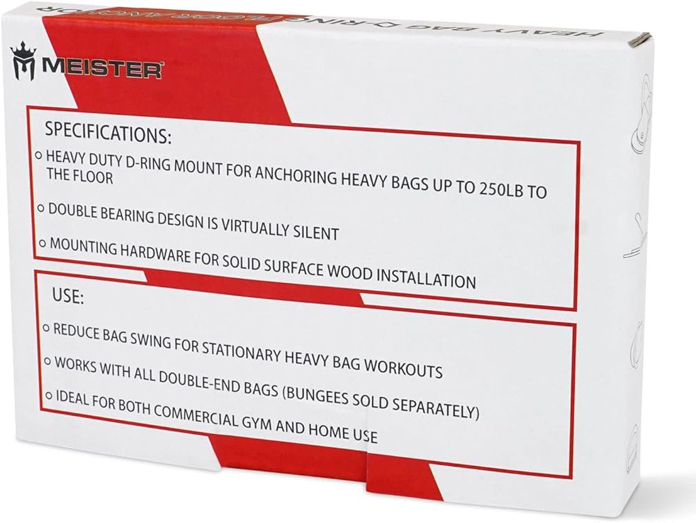 Stamped from heavy-duty steel, this mount is built to floor-anchor boxing, MMA & Muay Thai heavy bags of all sizes, so you can be sure it will handle anything you can throw at it. Two proprietary metal swivel bearings make this mount virtually silent, while providing ultra-consistent and predictable heavy bag swing so you can spend more time training, and less time chasing the bag. The Meister D-Ring Floor Anchor can also be used for double-end speed bags, tie-downs and many other floor-anchoring uses.