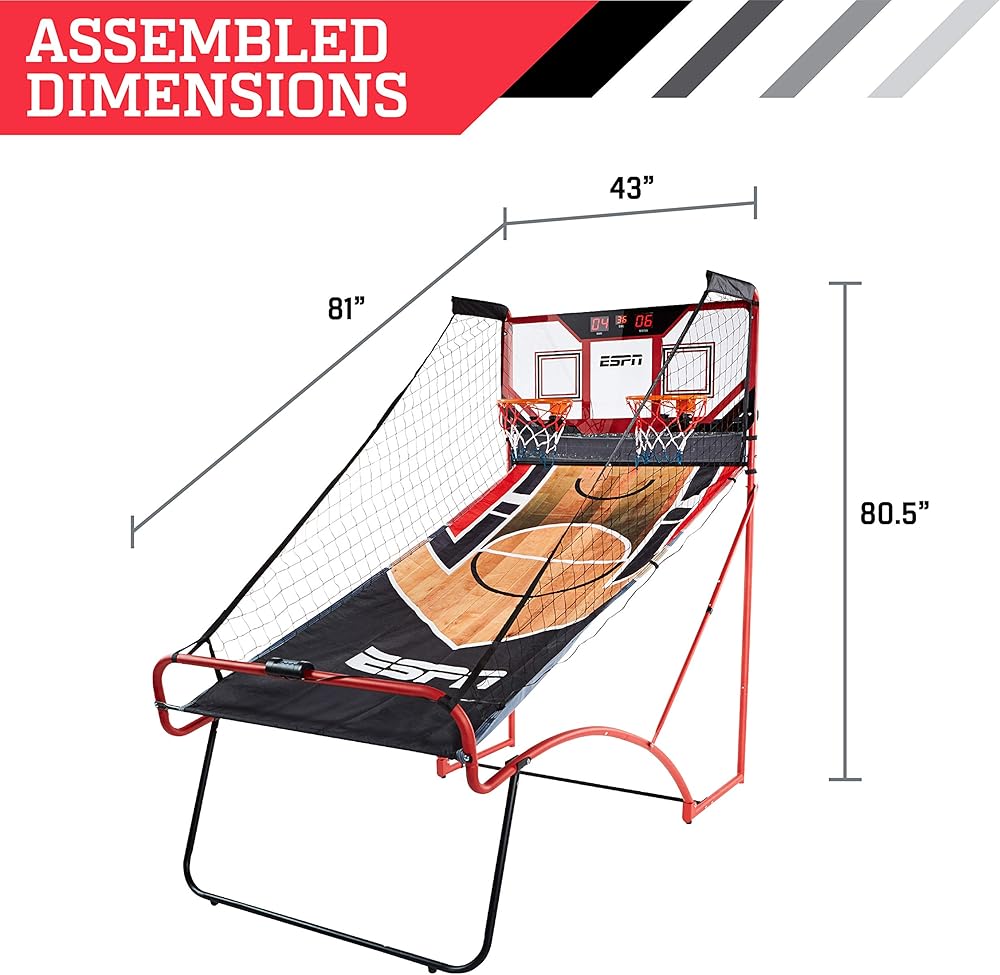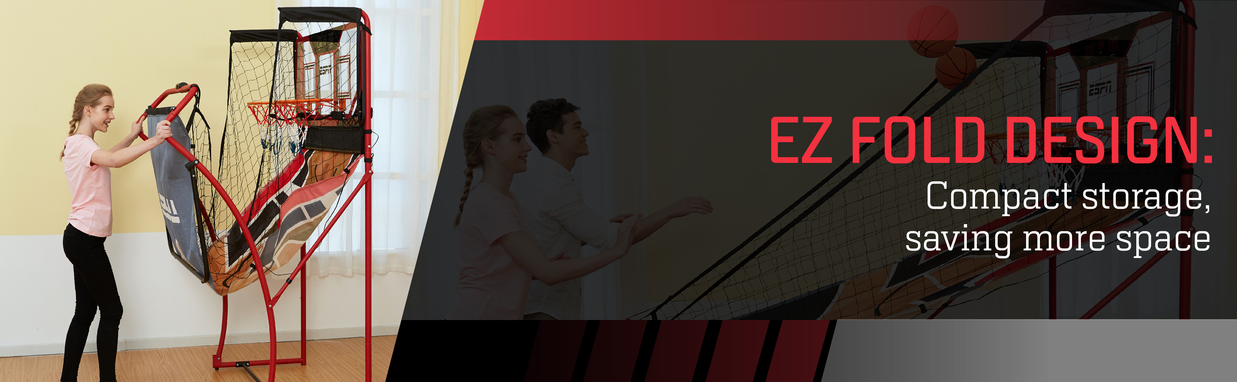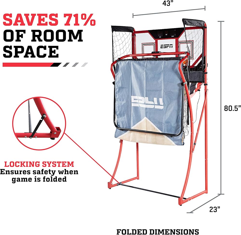 The ESPN 2 Player EZ-Fold Basketball Game with Polycarbonate Backboard and LED scoring is a great option for basketball enthusiasts of all ages. This game features a new folding design that is easy to use and offers improved storage space saving as compared to other arcade basketball games. There are 8 different games options built-in to the LED scoring system which can be played by 1 or 2 players. This foldable basketball game comes with everything you need to get started, including 4 basketballs and an air pump. Game easily stores away when not in use with built in locking system for safety. Keep your family active even when you're enjoying a day at home!