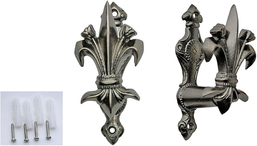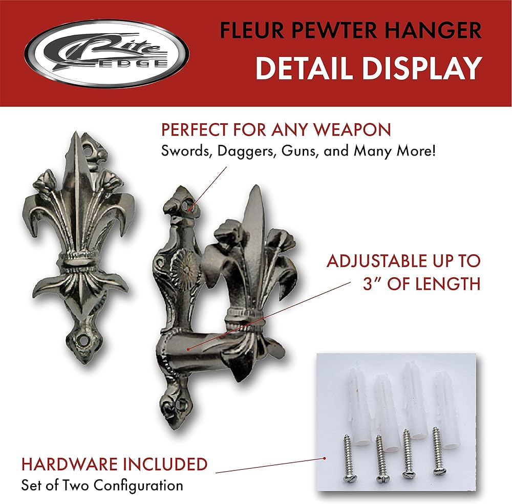 This Fleur Sword Hanger by Szco Supplies is 3 Inch in overall length. This hanger comes as a set of two. This hanger is adjustable to fit not only swords but daggers, pistols, canes, etc. The hanger is made of cast metal with a Fleur design.