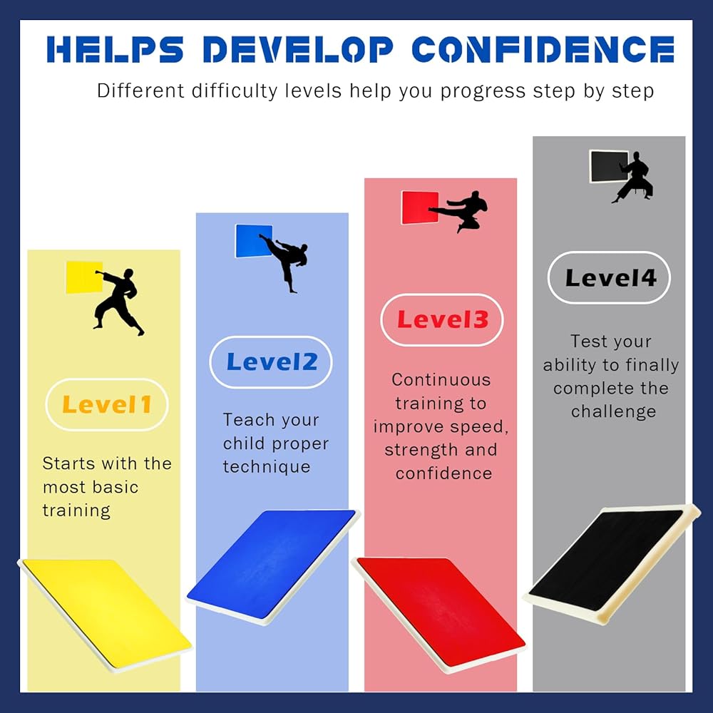 • لوح الكاراتيه المستوي: تم تصميم ألواح كسر الكاراتيه هذه مع 4 ألواح كاراتيه قابلة لإعادة الاستخدام بأربعة ألوان حسب اختيارك، وهي متوافقة مع مستويات المهارة المختلفة للتمرين؛ كل لون يمثل مستوى مختلفًا ويتوافق اللون مع لون الحزام؛ اللون الأصفر يمثل الأسهل والأسود هو الأصعب