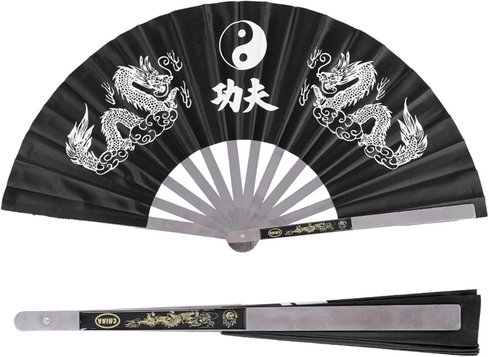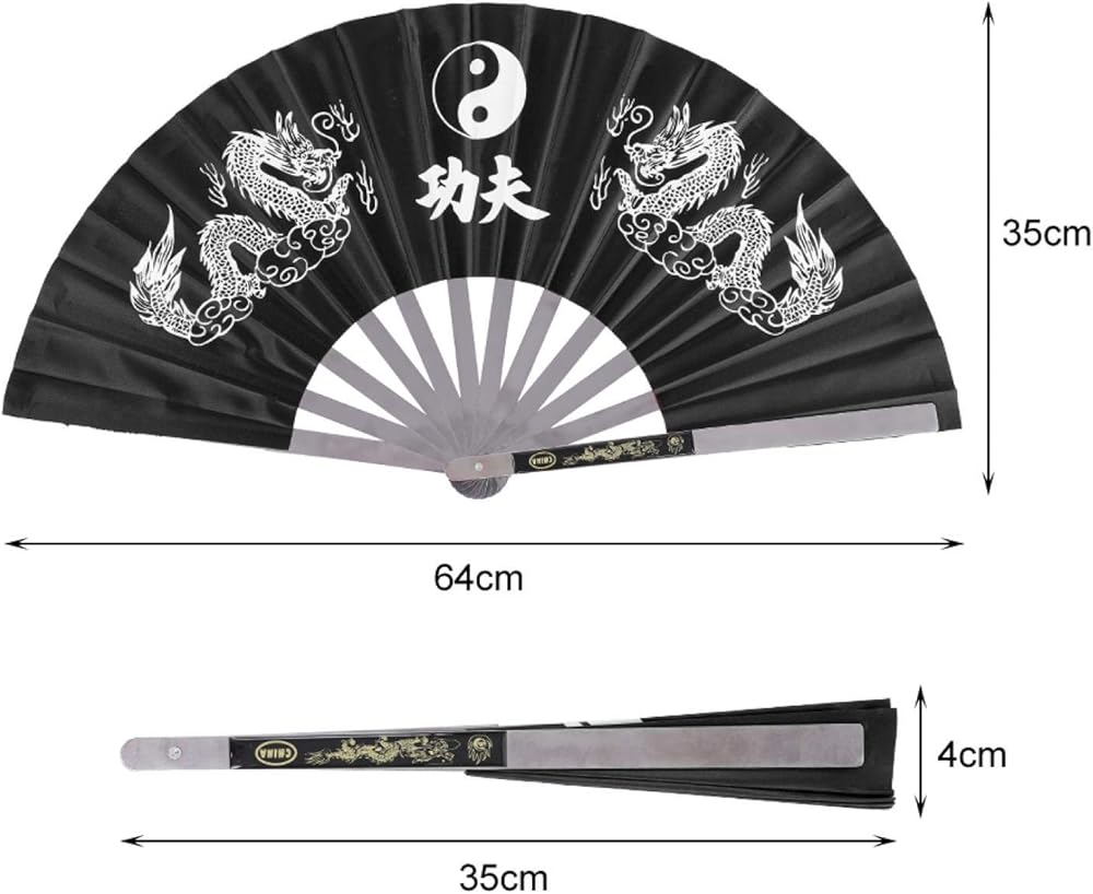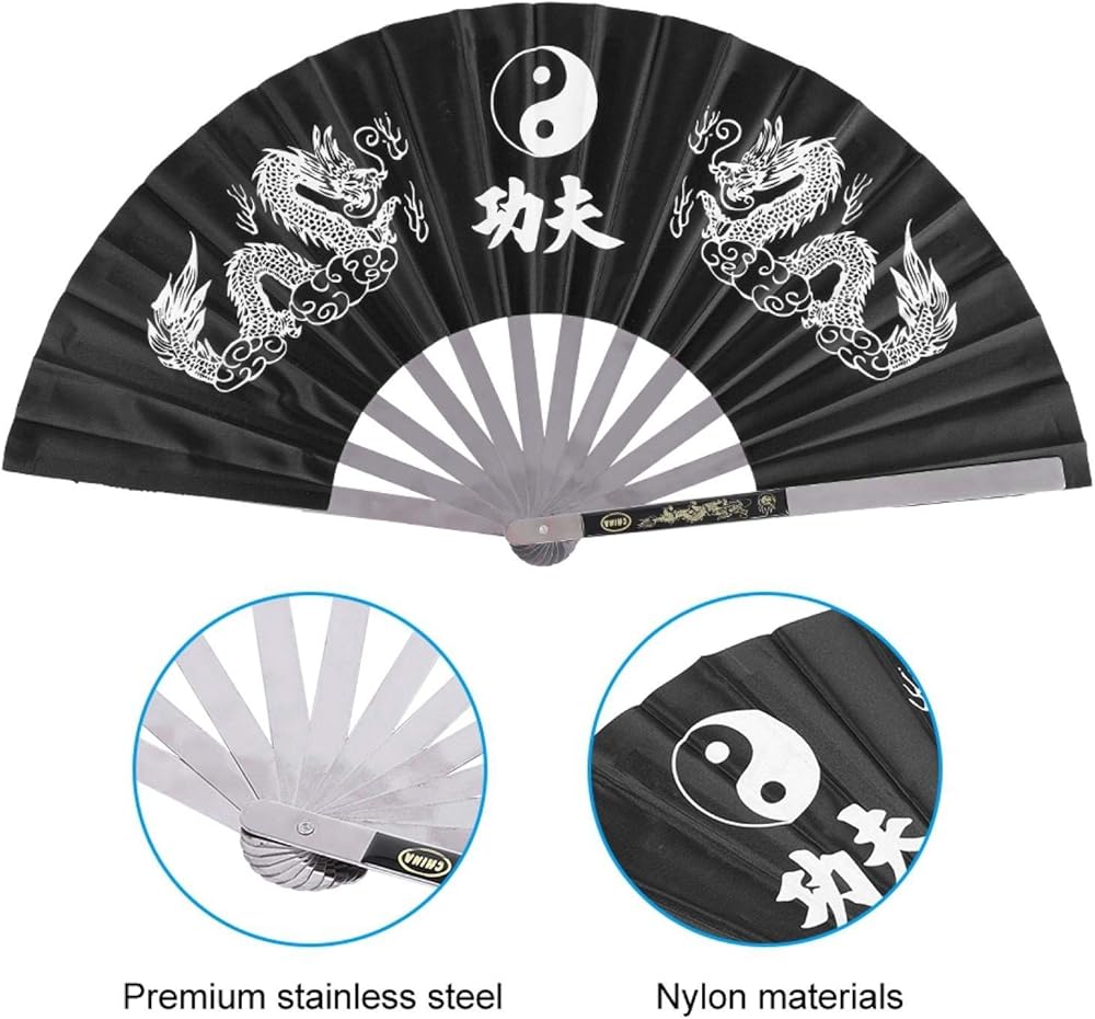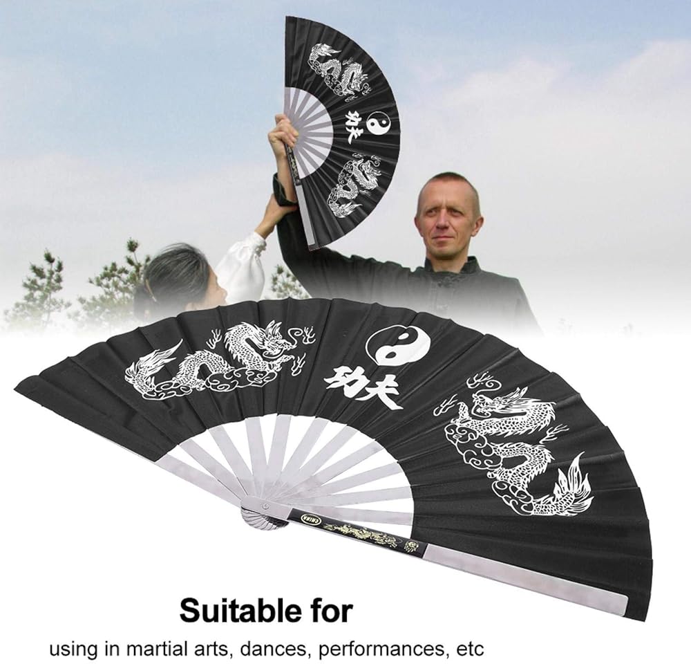 مروحة تاي تشي القتالية من الفولاذ المقاوم للصدأ، مروحة يد كبيرة قابلة للطي للفنون الكونغ فو وأداء التدريب على الرقص للرجال والنساء (أسود)