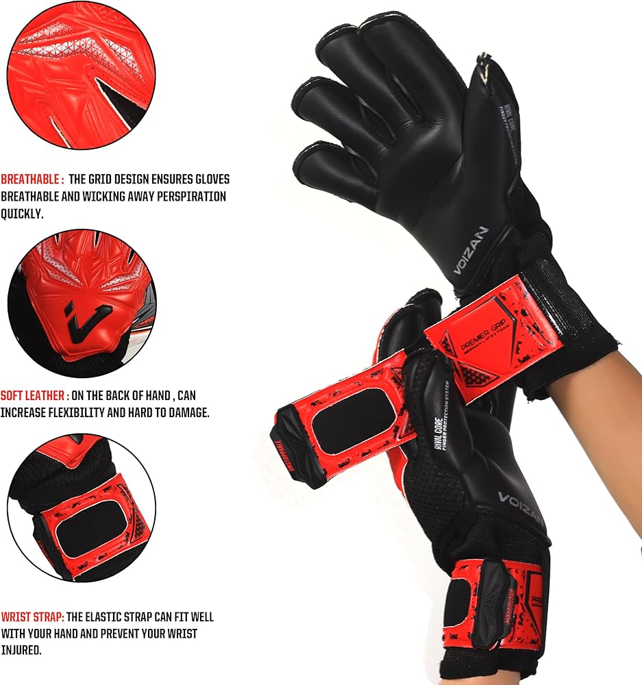• قفاز حارس المرمى المبطن المقاوم للصدمات: احمِ يديك من التسديدات والاصطدامات القوية باستخدام البطانة المقاومة للصدمات الموجودة في قفازات حارس المرمى الخاصة بنا. قل وداعًا للانزعاج ومخاوف الإصابة، حيث تسمح لك قفازات كرة القدم هذه باللعب بكثافة لا مثيل لها وتأمين مسيرتك المهنية في حراسة المرمى على المدى الطويل.