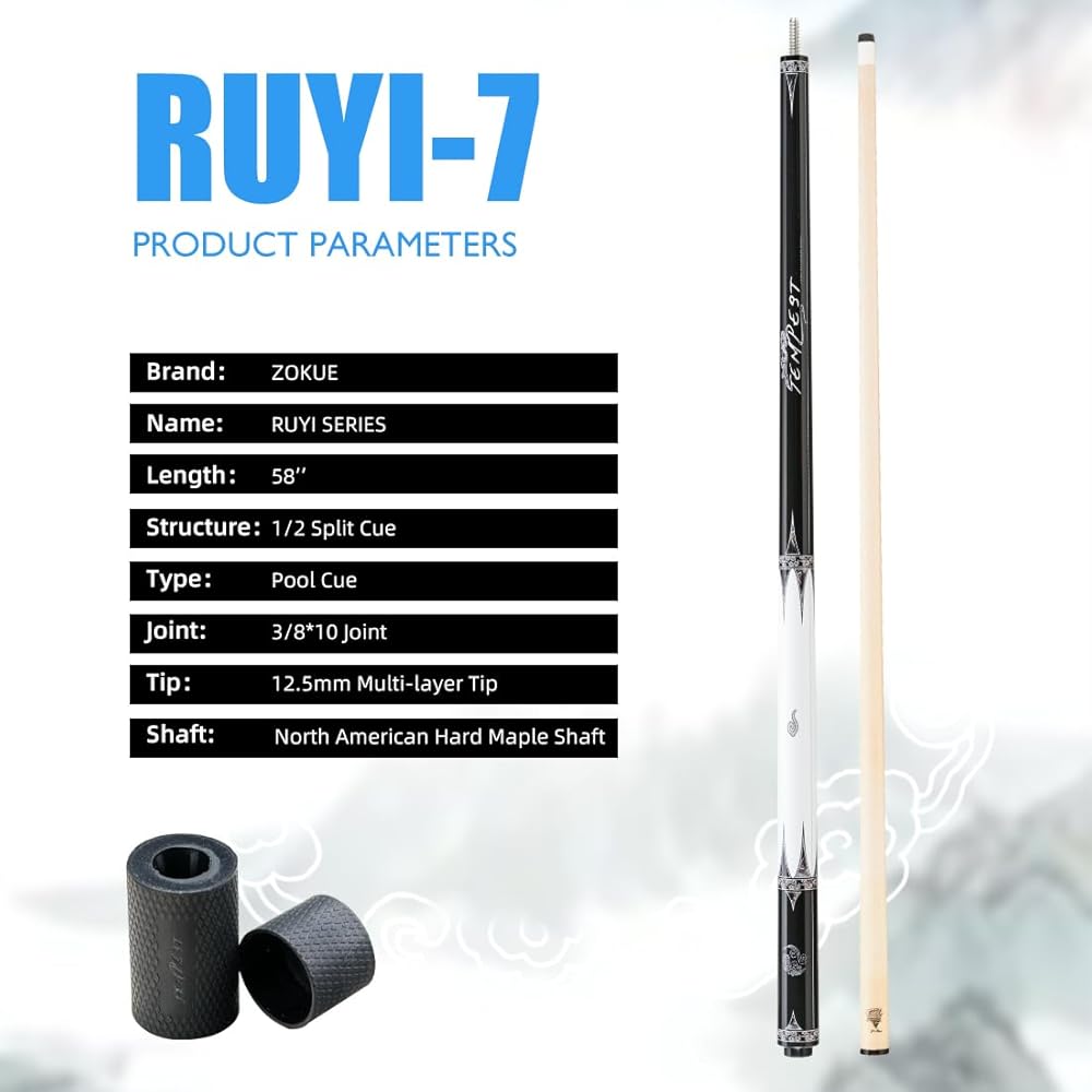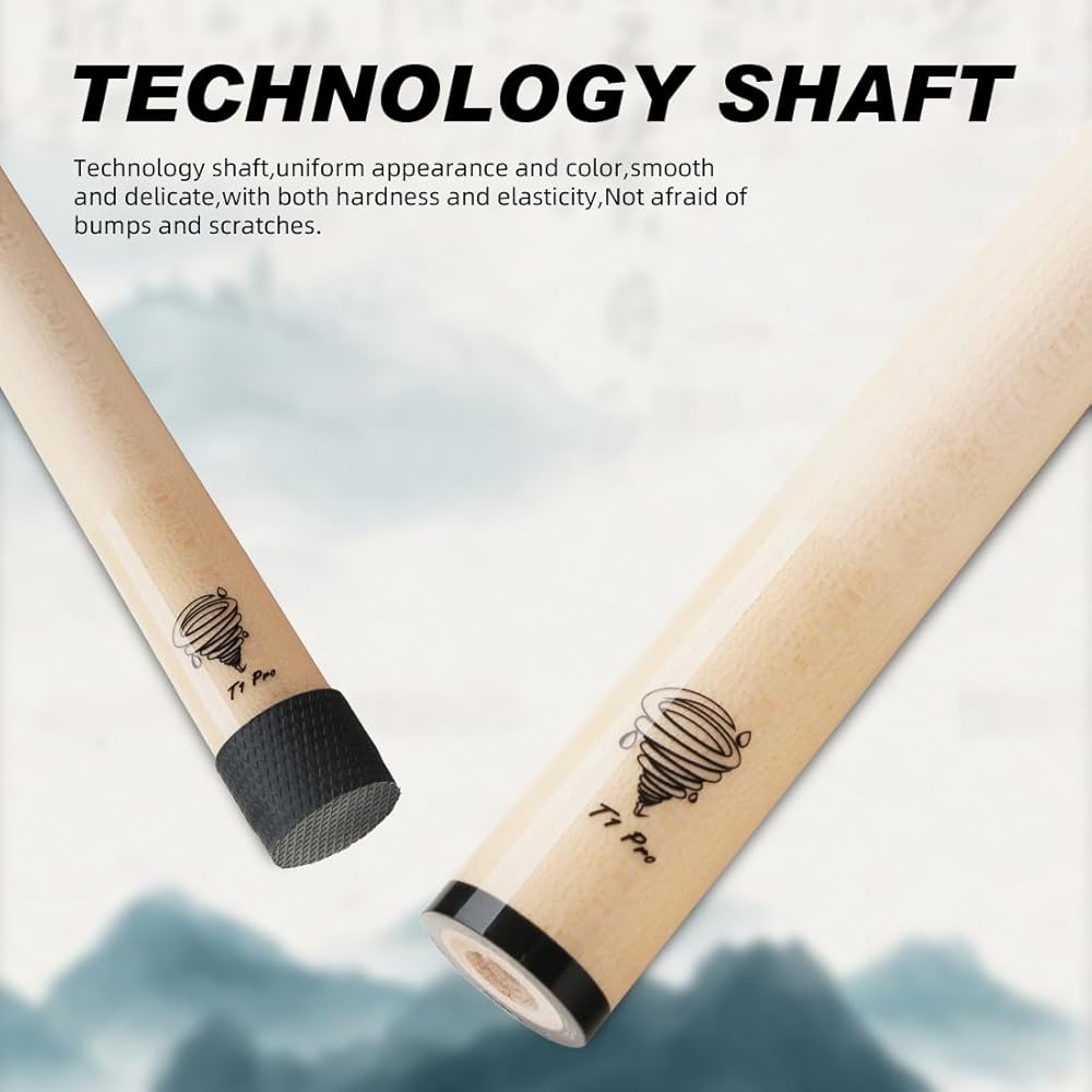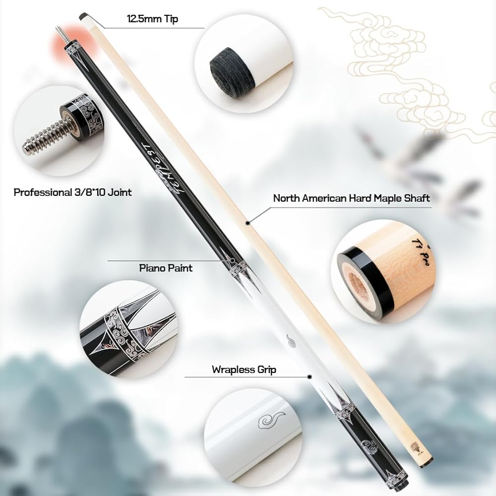 • Basic parameters: Length: 58" (147cm), about 12.5mm Tiger Tip, 3*8/10 Joint, 1/2 Split Cue, 19-21oz (adjustable), can be connected to an extension