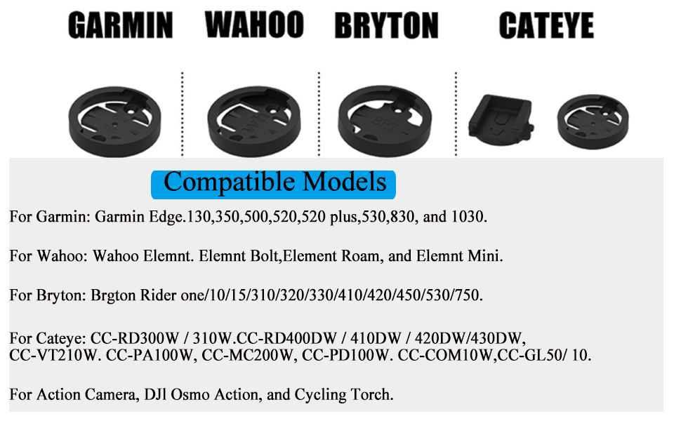 توافق واسع: يتوافق الحامل الأمامي للدراجة مع مجموعة كبيرة من أجهزة الكمبيوتر الخاصة بالدراجة. متوافق مع أجهزة كمبيوتر garmin edge 25 130 200 500 510 520 520plus 530 800 810 820 830 1000 1030 1040 وأجهزة كمبيوتر الدراجة GPS وWahoo. مناسب أيضًا لتركيب أجهزة الكمبيوتر الخاصة بالدراجات من برايتون، كاتي (ملاحظة: تحتاج إلى استخدام قاعدة جارمين للاقتران)، كاميرات عمل الواجهة، والهواتف الذكية وأضواء الدراجة.