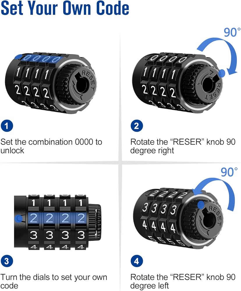 【مريح في الاستخدام بدون مفتاح】قفل كابل السكوتر عبارة عن مجموعة مكونة من 4 أرقام بدون مفتاح، فلا تقلق بشأن فقدان المفتاح ونسيان حمله. من السهل ضبط مجموعاتك الشخصية، فهناك ما يقرب من 10000 احتمالية لتأمين ممتلكاتك!