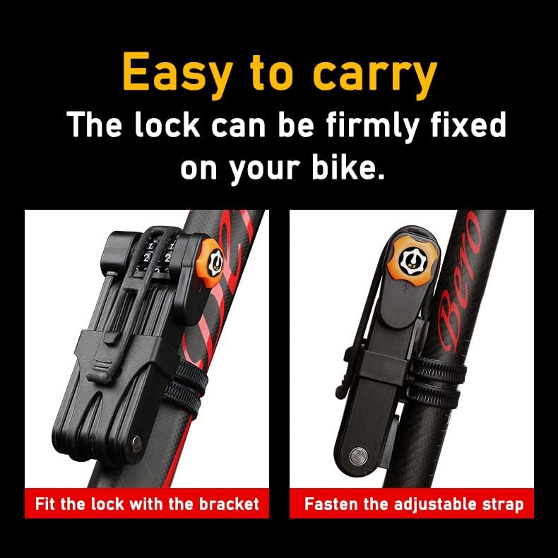 • دعامة تثبيت الإطار - مع التصميم الممتاز للدعامة سهلة التركيب، يمكنك تثبيت قفل الدراجة القابل للطي على إطار دراجتك. لن يهتز القفل أبدًا عند الركوب، ولن يكون هناك صوت من القفل حتى على الطريق الوعر.