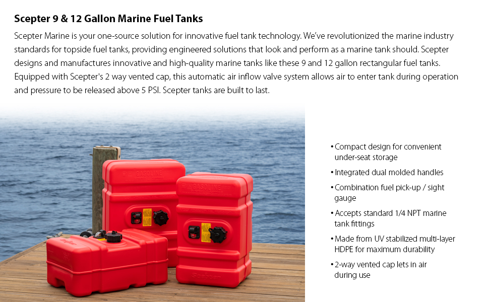 Smart. Trusted. Best-In-Class. Scepter Marine is your one-source solution for innovative fuel tank technology. We've revolutionized the marine industry standards for topside fuel tanks, providing engineered solutions that look and perform better than any other fuel tanks available. Scepter is the global leader in the design and manufacture of innovative and high-quality marine tanks like this 12 gallon marine fuel tank. Made from UV stabilized multi-layer HDPE for maximum durability. Equipped with Scepter's 2 way vented cap; this automatic air inflow valve system allows air to enter tank during operation and pressure to be released above 5 PSI. Scepter tanks are built to last. Caution: Tank swelling will occur. EPA regulations have eliminated the traditional venting in these tanks. New portable outboard marine fuel tanks will not vent below 5 PSI with noticeable swelling. The new EPA compliant cap will cause the portable outboard marine fuel tanks to swell. The swelling is a result of the fuel vapor building pressure, because the cap must stay sealed up to 5 PSI. The new tanks have been tested to remain sealed and safe at these pressures even when swelling is visible. Certifications: EPA: 40 CFR 1060 Fed Emissions Regulation; ABYC H-25 (2016) – Portable Marine Gasoline Fuel Systems; ASTM 2517-17 Child Safety; 40 CFR 1500