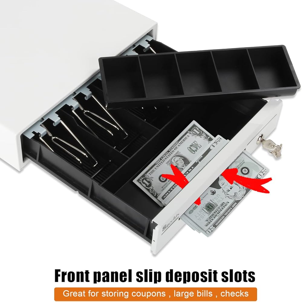 Sgorlds 14 "درج تسجيل النقدية لجهاز POS مع 4 فاتورة 5 عملة معدنية قابلة للإزالة بالكامل لدرج النقود المعدنية، 12-24 فولت، متوافق مع RJ11/RJ12، قفل مفتاح