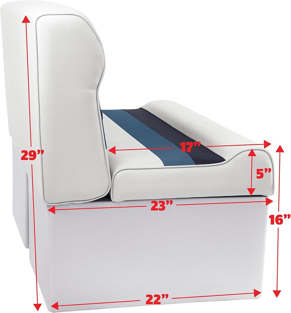 Wise Deluxe Series 37" Pontoon Bench Seat Cushion Only; Order Qty. 1 - #8WD100-1B-204 Deluxe Series Seat Base to Complete the Pontoon Seat (Sold Seperately) Features High Impact Rotational Molded Plastic Base. Injection Molded Plastic Seat Frame System. Marine Grade 28 oz. Vinyl, withstands the effects of sun, heat, rain and soiling under normal marine environment conditions. High Compression Virgin Foam Padding. Aluminum and Stainless Steel Hardware. Easy Assembly. 5 Popular Color Combination Options: #1008 White/Navy Blue, #1009 White/Red/Charcoal, #1010 Sand/Chestnut, #1011 Grey/Navy/Blue #1012 Grey/Red/Charcoal. Add Wise Deluxe Series Arm Rests as a Finishing Touch. Choose from Several Deluxe Series Configurations to Refresh Your Pontoon!