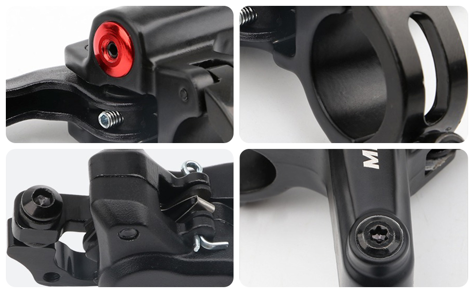 المواد: الفرجار الهيدروليكي الأمامي/الخلفي كلاهما مصنوع من سبائك الألومنيوم الممتازة ومرفق بمحول IS/PM ليتيح لك تثبيت إما شوكة/إطار IS أو PM بسهولة. أذرع الفرامل الهيدروليكية مصنوعة من سبيكة مغلقة قوية ونقطة واحدة لحقن الزيت لتتيح لك الحفاظ على الفرامل بسهولة عن طريق تغذية زيت الميل. تناسب الرافعة المقود الأكثر شيوعًا بقطر 0.87 بوصة (22 مم).