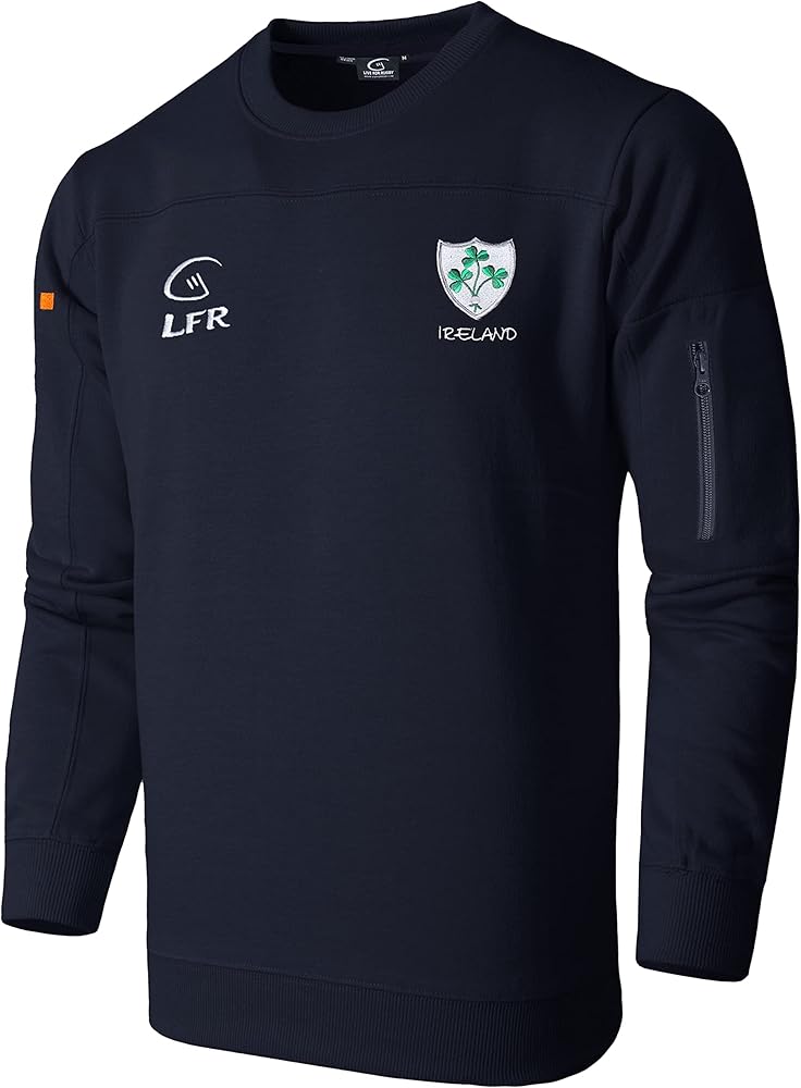 Our stylish Crew Neck Rugby Side Zip Pocket is great as a souvenir or simply for everyday wear. It is made of soft poly-cotton knit that is sure to keep you stylish and warm! It features a zippered side zip pocket on the arm that gives you secure place to store items. Guaranteed to keep you warm while proudly showing your Irish roots! embroidered Rugby Shamrock crest with 'Ireland' on left side of chest embroidered 'LFR' logo on right chest embroidered flag on right sleeve long sleeves ribbed cuffs and hem YKK quality zipper polyester/cotton blend