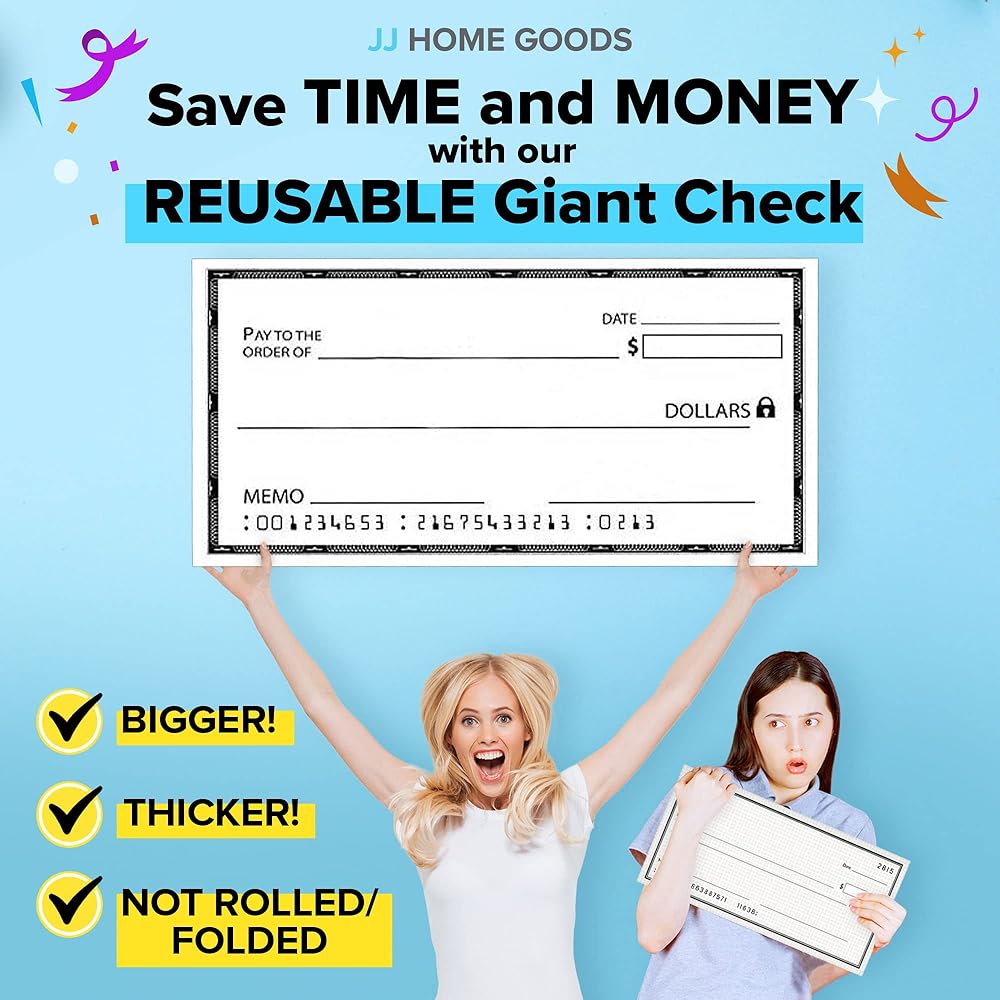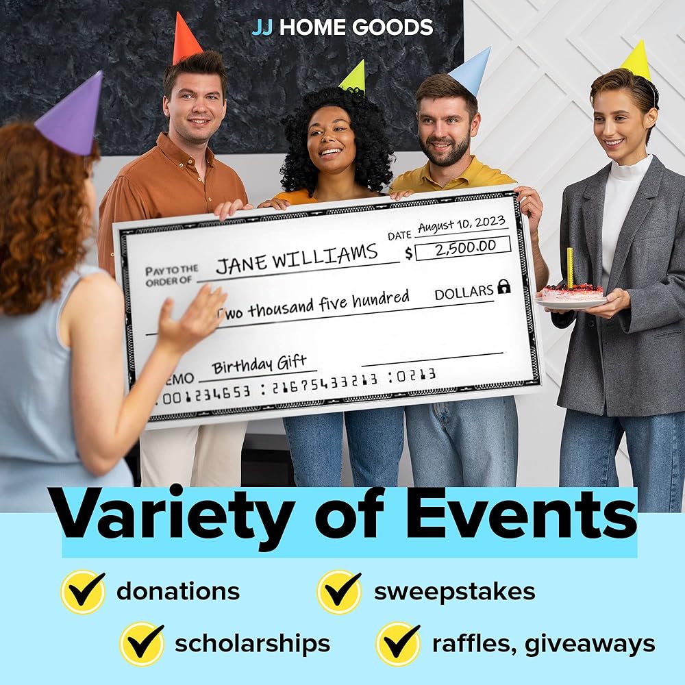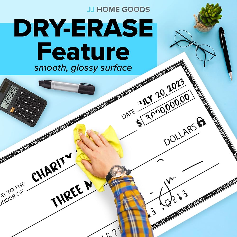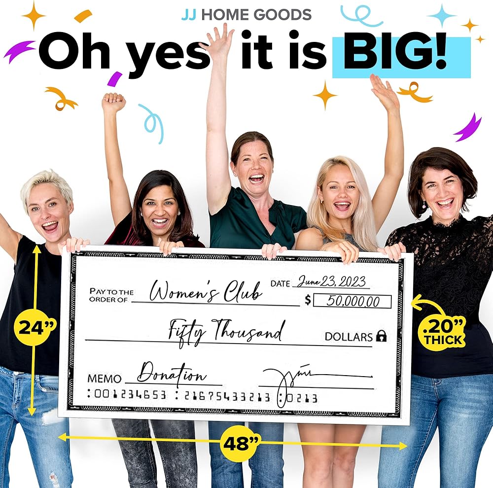 JJ Home Goods شيك عملاق للمسح الجاف [48 بوصة × 24 بوصة] شيك مزيف كبير الحجم - شيكات كبيرة للعروض التقديمية - شيك كبير قابل لإعادة الاستخدام لجوائز التبرع وجمع التبرعات ومسابقات اليانصيب الخيرية