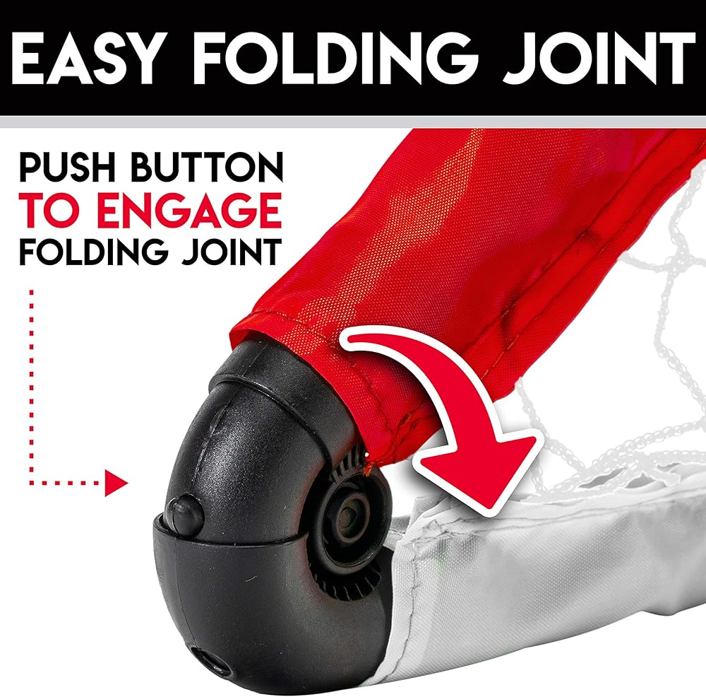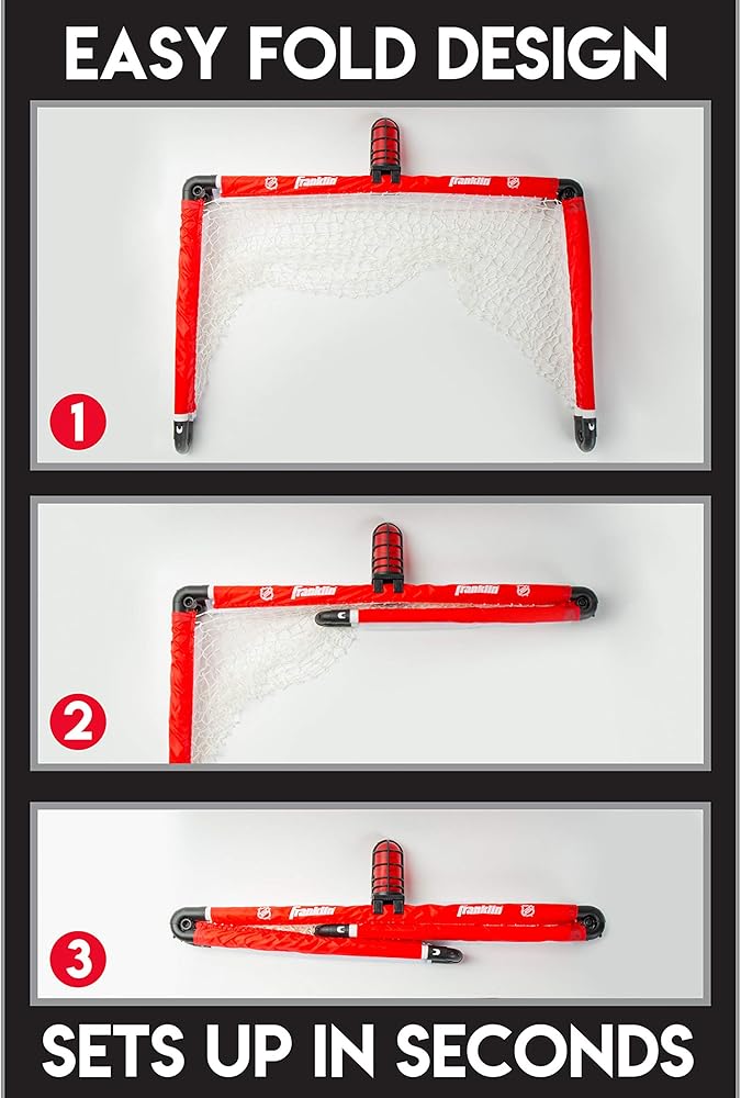 Parents, you'll be glad to know that the set comes with foam hockey balls, so your windows should be perfectly safe, even if the hockey balls are hit hard! The set is durable enough to stand up to regular use and even the most competitive gameplay. Available in red and black, with both right and left-handed player sticks and goalie sticks. Entire set folds away neatly for simple storage when not in use.