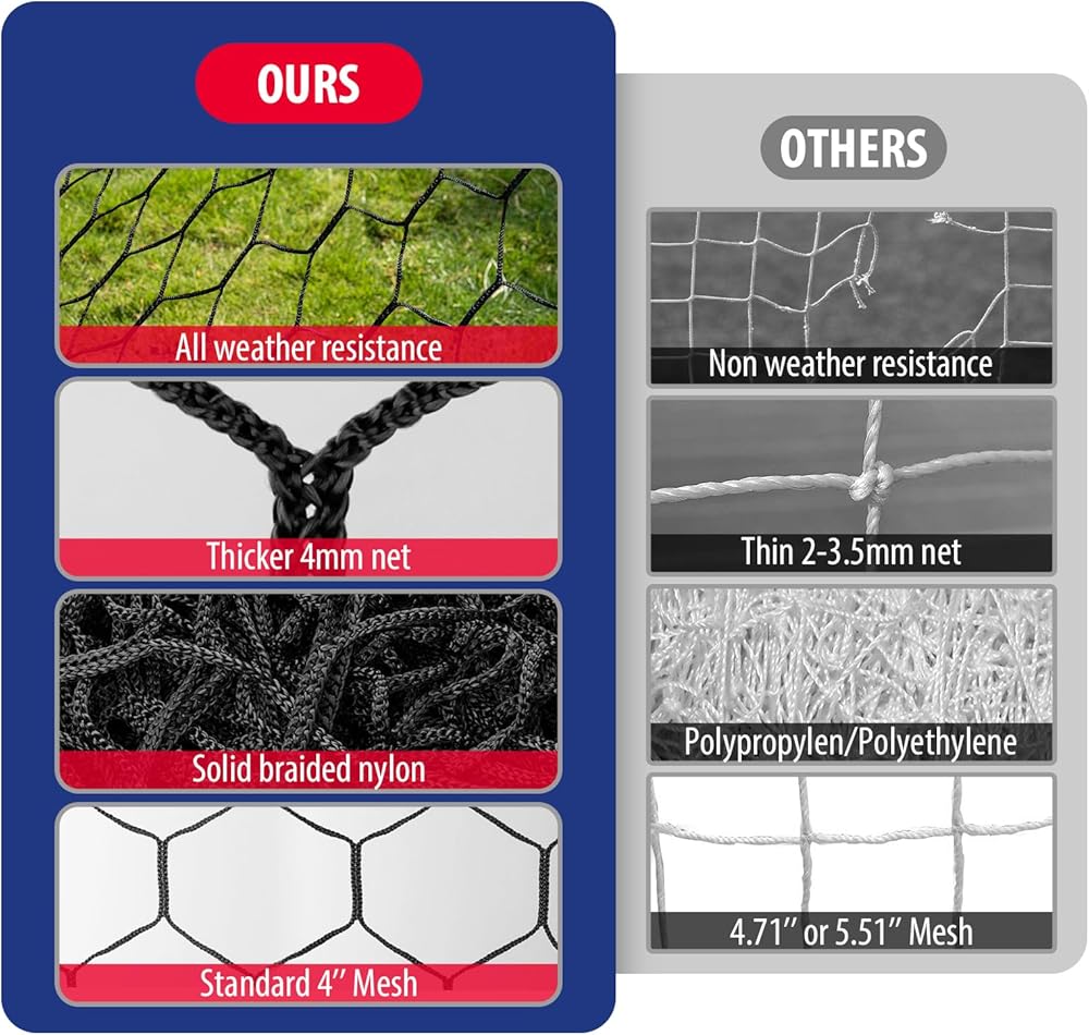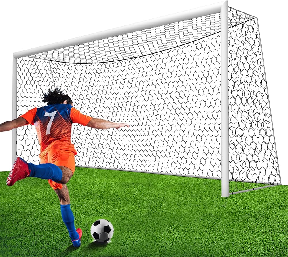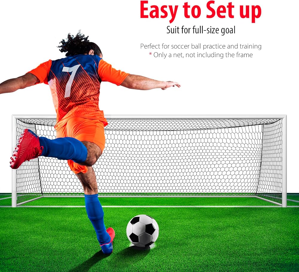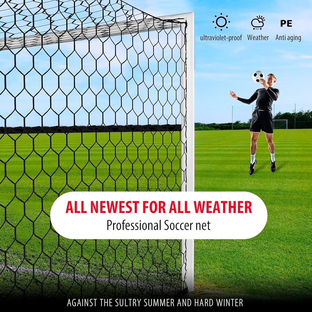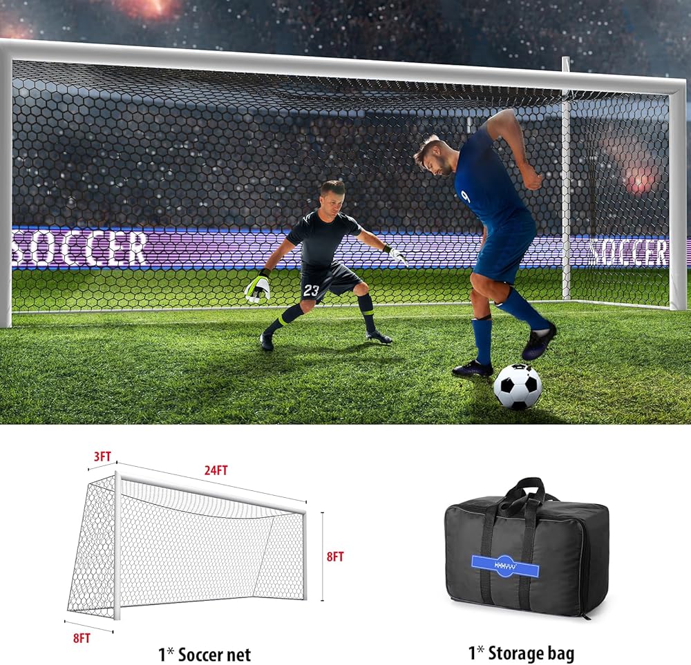 【جودة المنافسة القصوى للمتانة】تم تصميم شبكات كرة القدم للأهداف 24 × 8 للاستخدام القاسي: نايلون مجدول صلب بسمك 4 مم، مجهز بقوة كسر أفضل، ومقاومة أعلى للتآكل؛ إعادة تعريف المتانة العالية والتأثير العالي ومقاومة التآكل؛ ضد الانهيار تحت ركلة أكثر عدوانية بعد ركلة