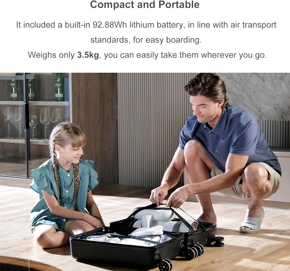مدمجة ومحمولة: تتضمن بطارية ليثيوم مدمجة بقوة 92.88 وات في الساعة، بما يتماشى مع معايير النقل الجوي، لسهولة الصعود. تزن 3.5 كجم فقط، ويمكنك أخذها بسهولة أينما ذهبت.