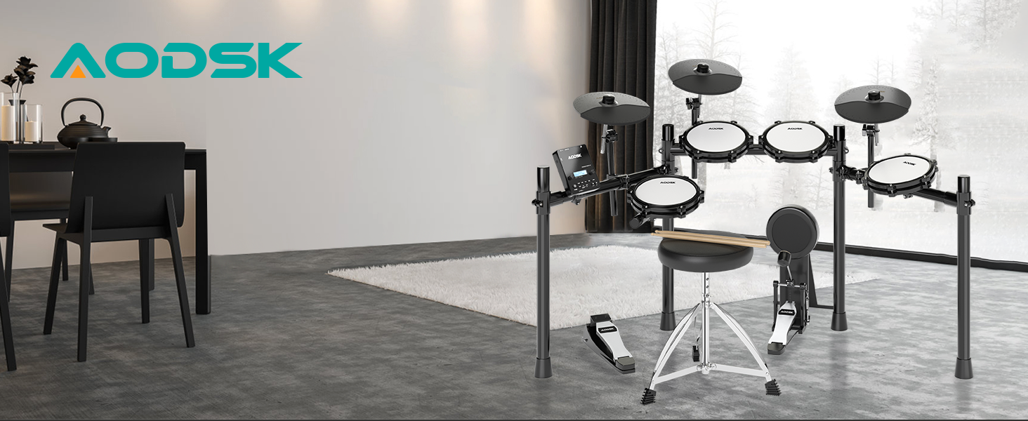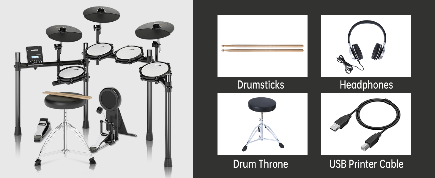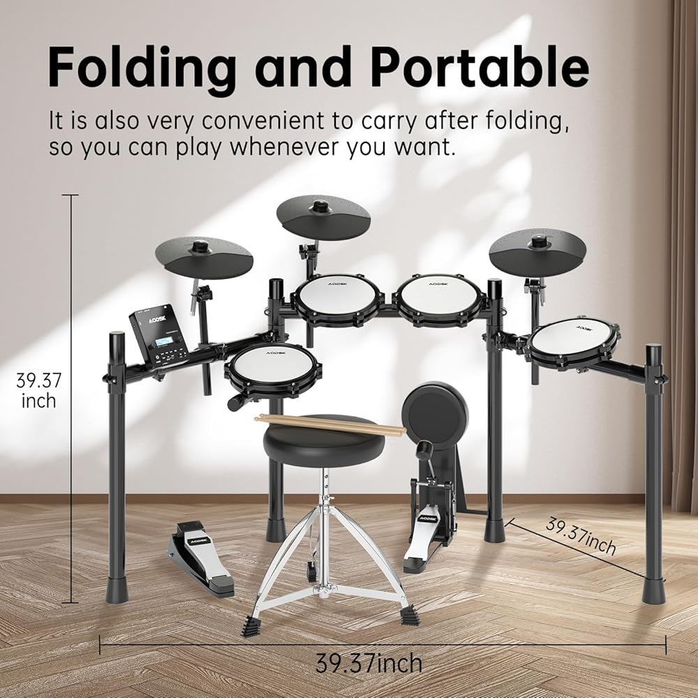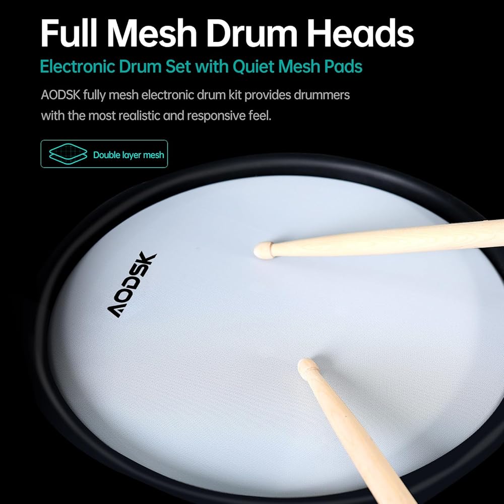 مجموعة الطبول الكهربائية AODSK، مجموعة الطبول الإلكترونية للبالغين مع 455 صوتًا، وسادات طبلة شبكية، وعصي الطبل، ودواسات شديدة التحمل، وعرش الطبل، وسماعات الرأس متضمنة (UAED-5DS)