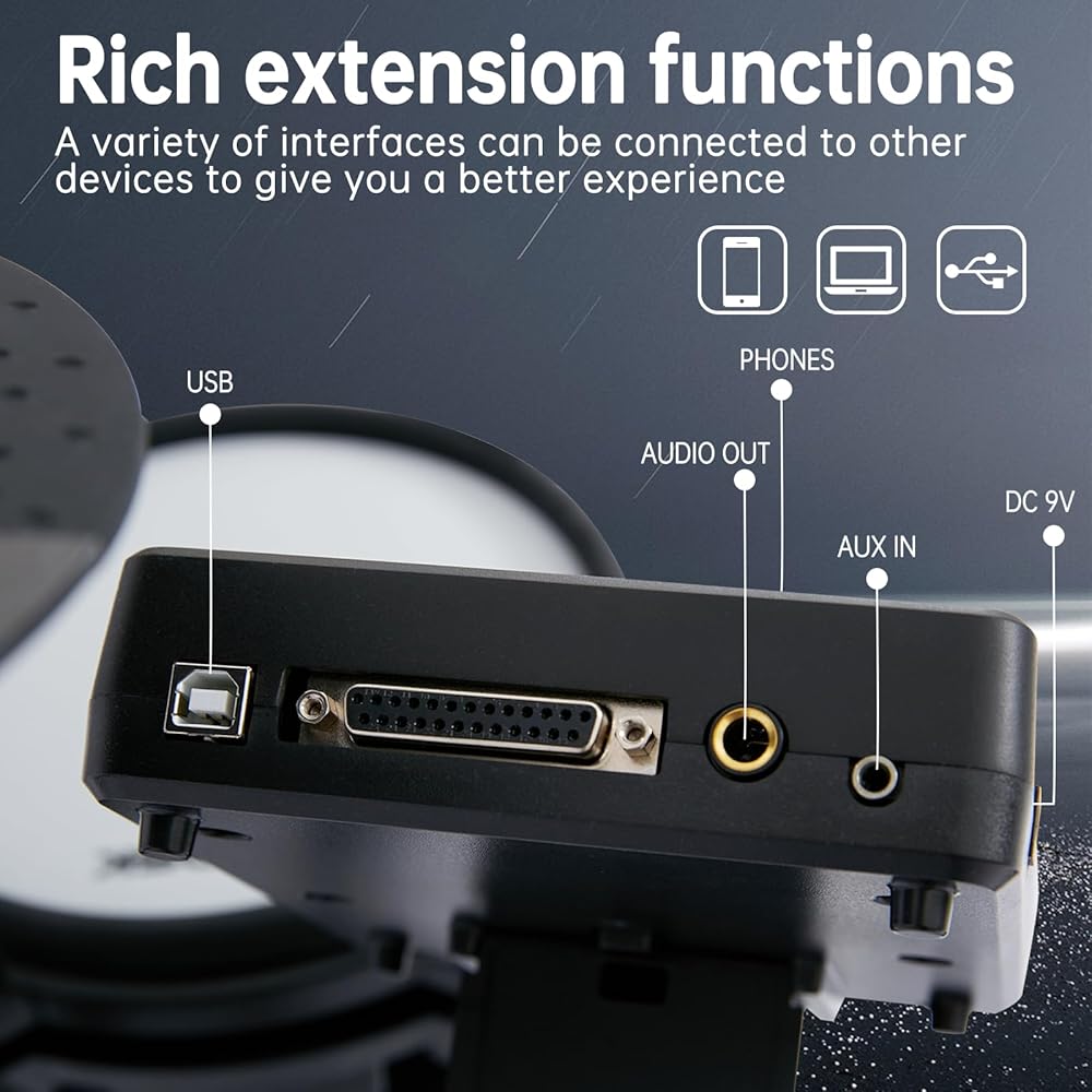 【اتصال للموسيقيين العصريين】: مجموعة الطبول الكهربائية AODSK مجهزة للعصر الرقمي، وتتميز باتصال USB MIDI، ومقابس سماعة الرأس للتمرين الصامت، وإدخال/إخراج الصوت من أجل التكامل السلس مع المعدات الأخرى.