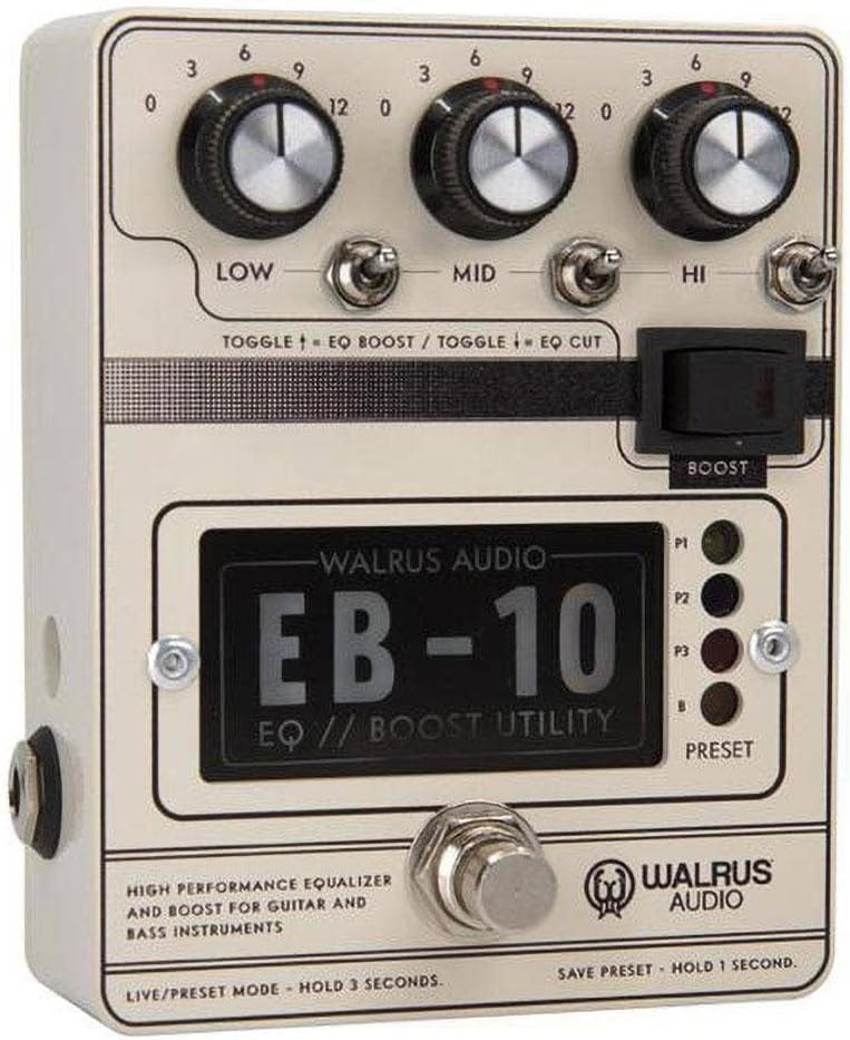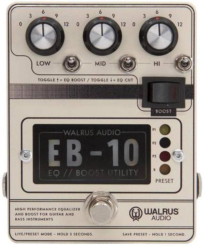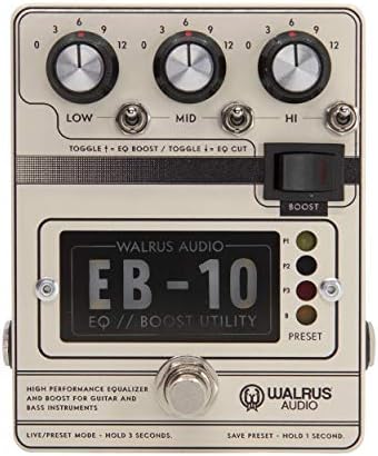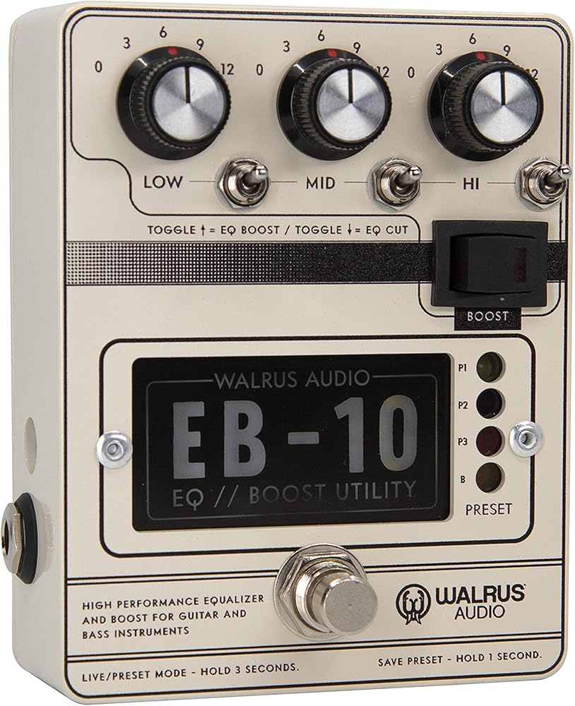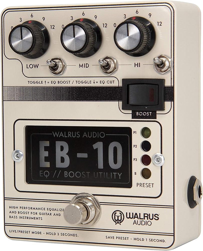 A tone tweaks delight, the eb-10 works as a preamp, EQ and boost with three available presets to meticulously craft your guitar's sound allowing for studio-grade electric guitar tone in a live setting. Each rotary knob offers up to 12dB of boost or cut of low, mid, and high frequencies, based on where you have the toggle switches set. When the boost switch is engaged, add a 10dB MOSFET boost For some great extra punch. Use the eb-10 to compensate when switching between low and high output instruments. Push through the mix during solos, or even use The onboard presets as three different gain stages by using combinations of increasing boosted EQ settings and the boost switch With nine different EQ positions on each knob, bring out new tonal characteristics you didn't know your guitar or bass even had. The eb-10 offers two operating modes, “live” and “preset”. in live mode, the pedal responds to current position of all the knobs and switches. Dial in a specific sound and turn the pedal on and off with the bypass switch. In preset mode, the pedal offers preset slots to store Three unique sounds. When in preset mode, the pedal is locked on and the user can scroll through the presets by clicking the bypass switch. The pedal will Boot up in the last known operating mode and if that is preset mode, It loads preset 1 by default. Enter preset mode by pressing and holding the bypass switch for 3 seconds until you see the preset light P1 turn on. Repeat to exit. You are in live mode when all preset lights are off. Refer to the manual on saving presets.