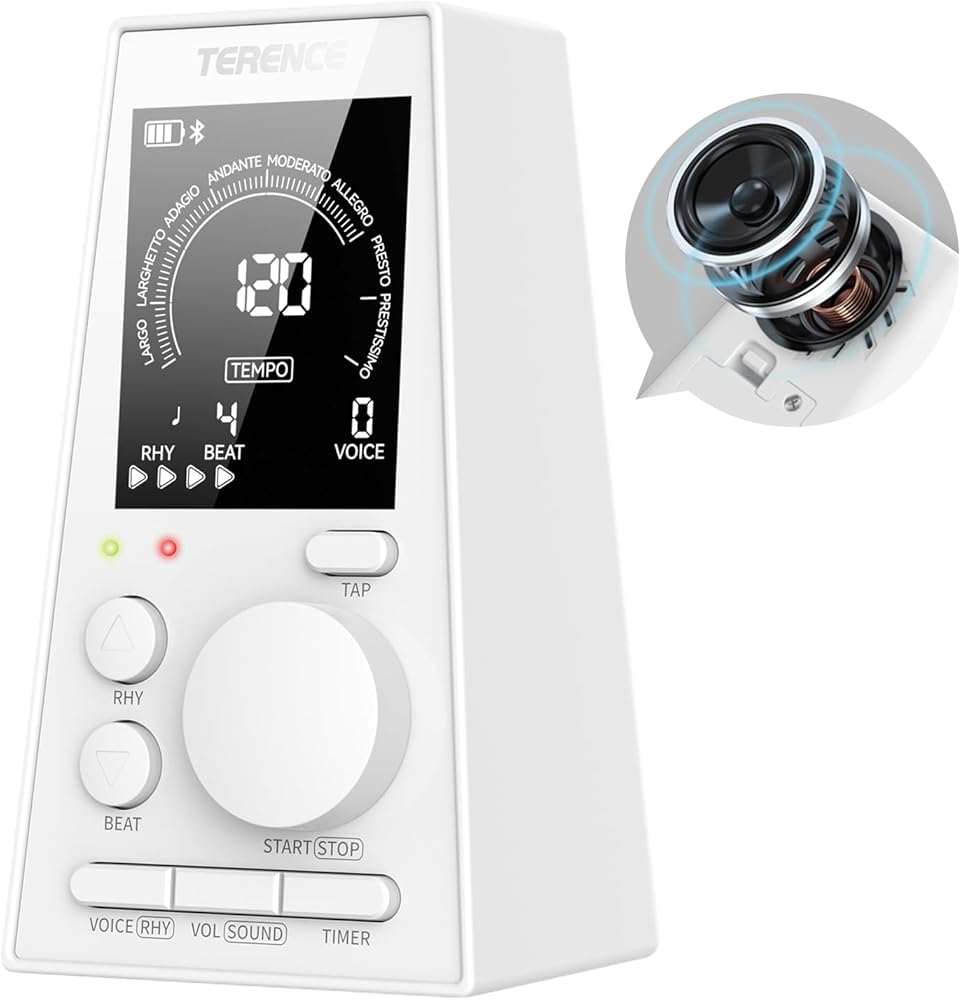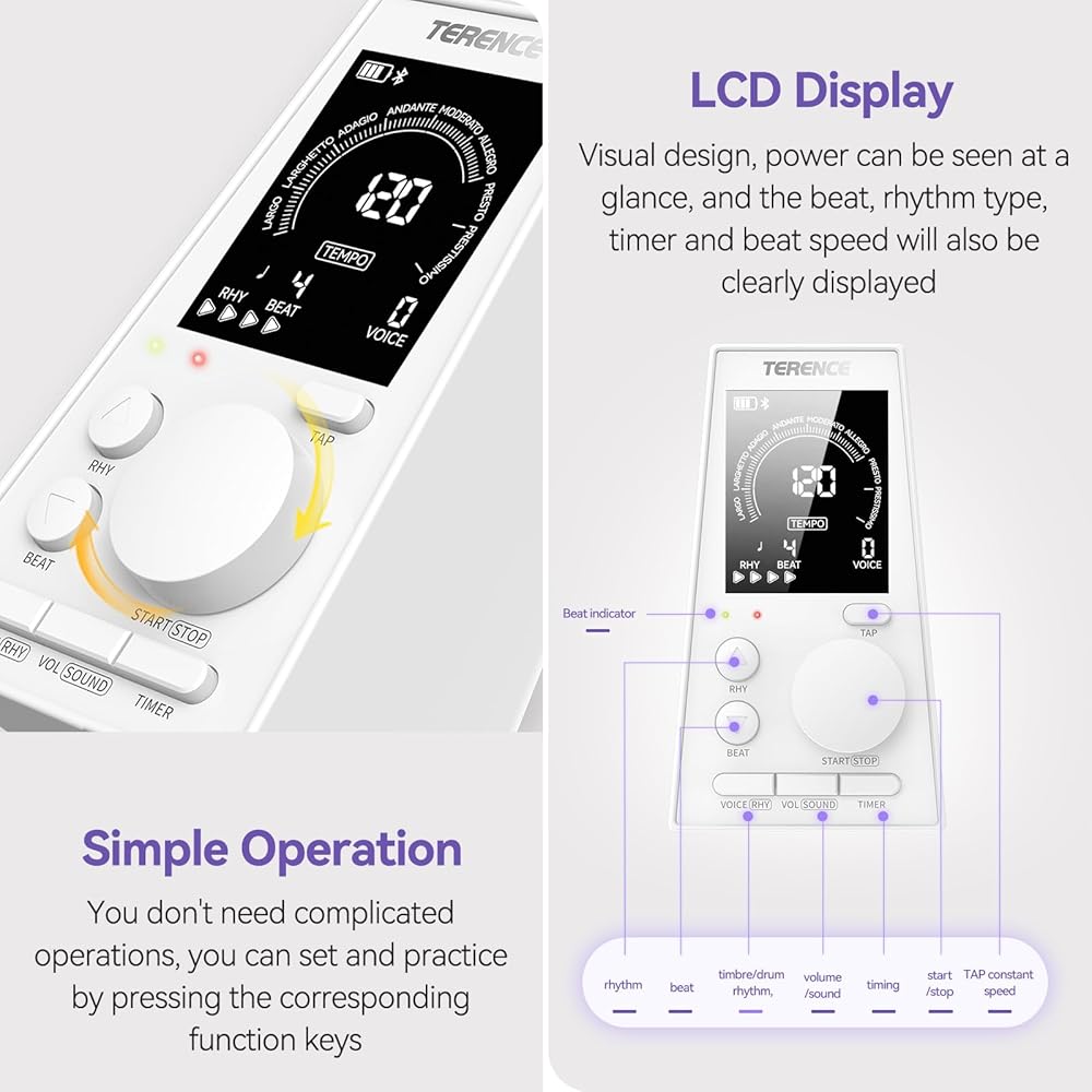 • مطور: بالمقارنة مع بندول الإيقاع التقليدي، فإن الإصدار المبتكر من بندول الإيقاع يحتوي على بطارية مدمجة قابلة لإعادة الشحن، والتي يمكن تشغيلها ليس فقط في المنزل، ولكن أيضًا في العروض الخارجية والحفلات الموسيقية الخارجية وغيرها من الأماكن التي لا يمكن ضمان إمداد الطاقة بها. توفر لك الشريحة المُحدثة المدمجة تجربة أداء أفضل. إنها مجهزة بشاشة LCD، والتي لا تظهر فقط شحن البطارية في لمحة واحدة، ولكنها تظهر بوضوح أيضًا الإيقاع ونوع الإيقاع والمؤقت وسرعة الإيقاع