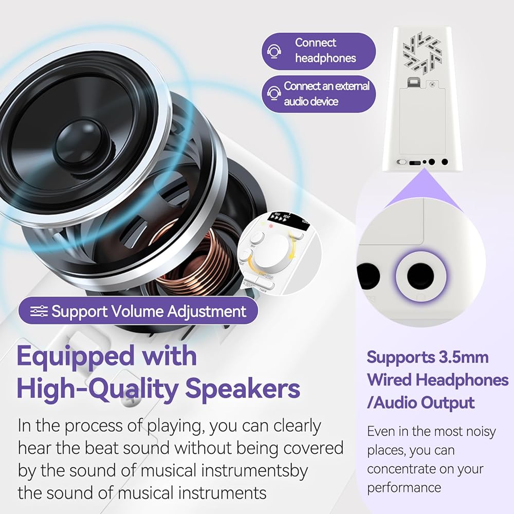 • مكبرات صوت عالية الجودة مزودة بمقبس صوت 3.5 ملم وحجم قابل للتعديل: تم تجهيز المسرع الإلكتروني بمكبرات صوت عالية الجودة، لذلك لن يغرق صوت الإيقاع بصوت الجهاز ويمكن سماعه بوضوح. علاوة على ذلك، فهي مجهزة أيضًا بسماعة أذن مقاس 3.5 ملم، حتى تتمكن من تجاهل المناطق المحيطة والتركيز على اللعب بنفسك حتى في مكان مفاجئ. بالإضافة إلى ذلك، يمكن تعديل مستوى الصوت، ويمكنك ضبط مستوى الصوت وفقًا لعاداتك الخاصة