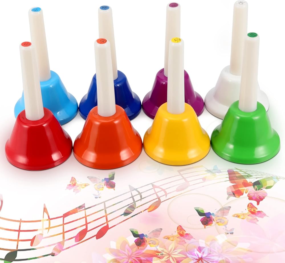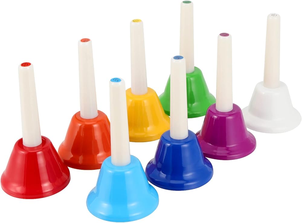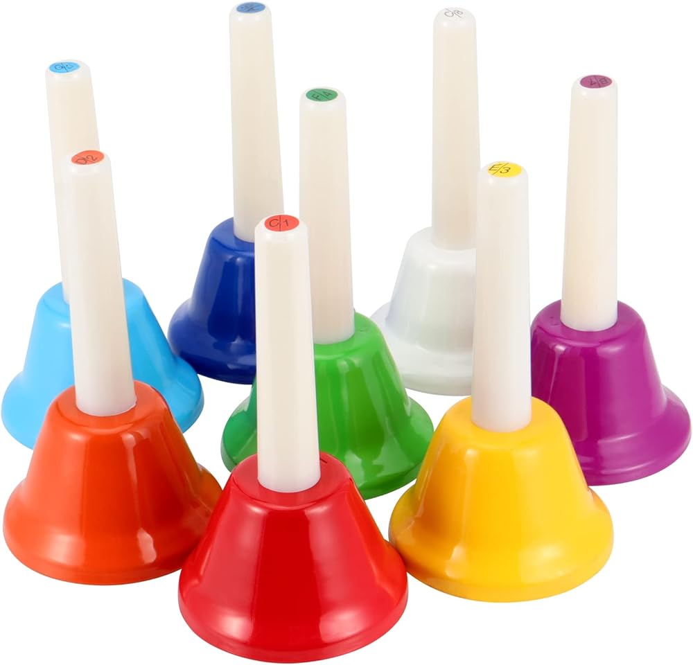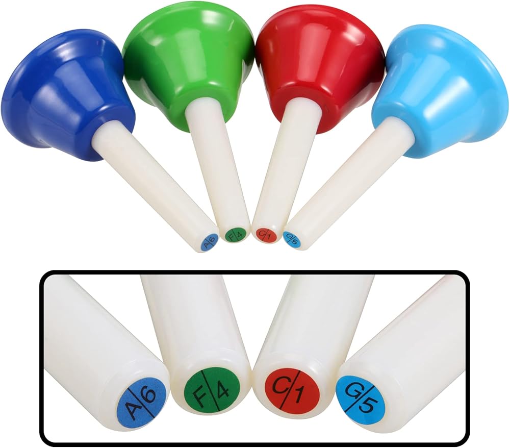 • DIATONIC HANDBELLS - The 8 note handbells are marked notes from Middle C, D, E, F, G, A, B to High C on the plastic handle and tuned correctly. Each note can emit a clear and rich sound, and suitable for music beginners to use, to help them recognize sounds and tones.