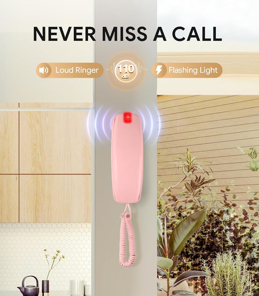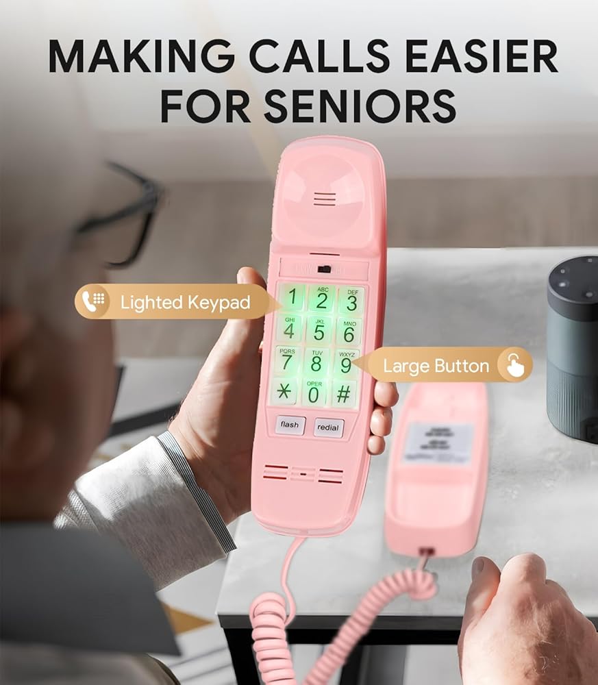 هاتف Sangyn الثابت لهواتف الحائط المنزلية مع التحكم في مستوى الصوت لكبار السن ولوحة مفاتيح مضاءة بزر كبير، لا يتطلب طاقة تيار متردد، إعادة الاتصال، ضوء فلاش، هاتف سلكي من Trimline للمنزل والمكتب والمدرسة