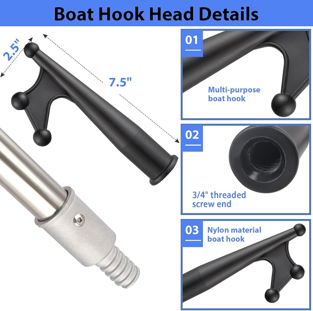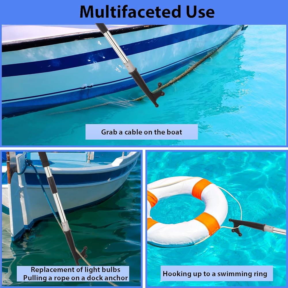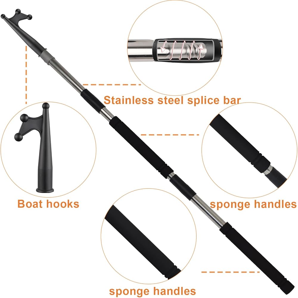 The boat hook for docking, splicing and floating adjustment can extend from 48inch dock pole tube of multipurpose ship is made of stainless steel, which is very strong and does not rust.
