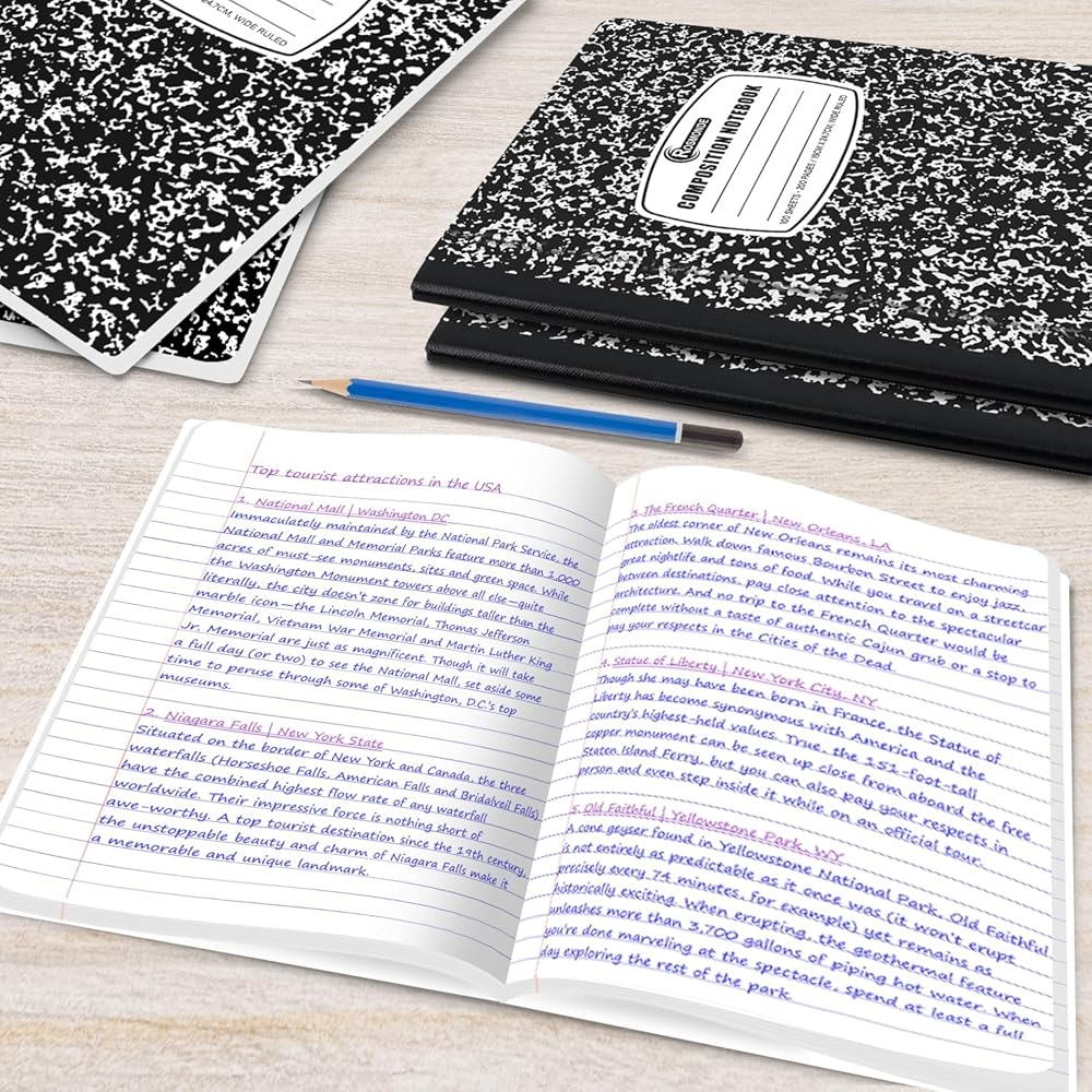 أوراق واسعة النطاق: يحتوي كل دفتر ملاحظات على أوراق مسطرة بعرض 7.5 سم × 9.75 سم، لمساعدتك في الحفاظ على تنظيم ملاحظاتك. يتعامل الورق عالي الجودة لهذا الكمبيوتر الدفتري ذو التركيبة الرخامية مع أقلام الرصاص الميكانيكية وأقلام الجل وأقلام الحبر وأقلام التحديد للحصول على ملاحظات مثالية ولن ينزف الحبر حتى تحصل على تجربة رائعة.
