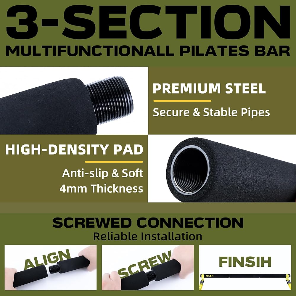 WORKOUT IN ANYWHERE: KRIXAM portable pilates workout bar with 3-sections is quite easy to set up or disassemble. The detachable and space-saving characteristics of the Pilates exercise bar sets allow you to store them without taking up a lot of space, and exercise at home, in the office, on travel, vacation, etc.