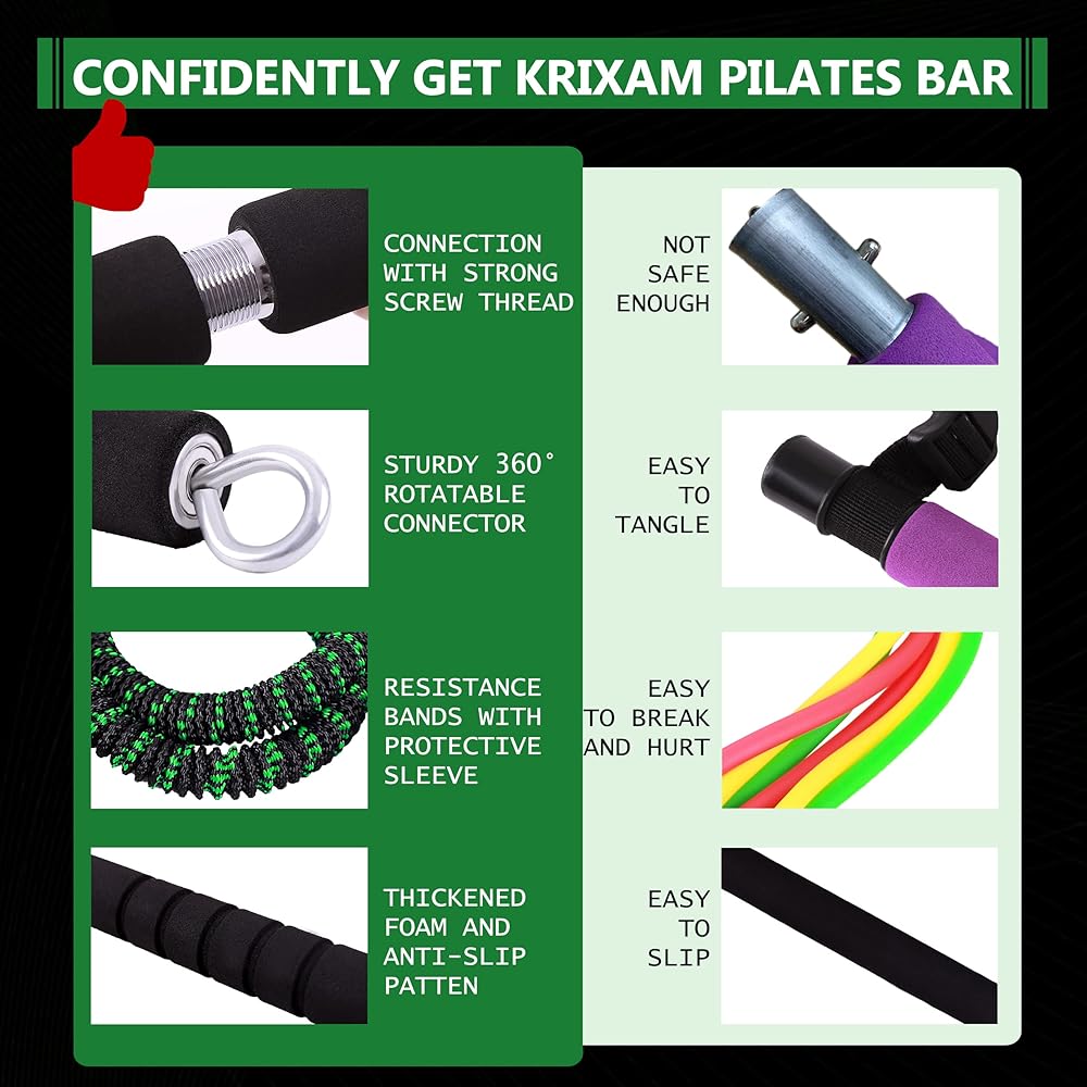 مادة عالية الجودة: مجموعة قضبان البيلاتس من كريكسام مصنوعة من الفولاذ المقاوم للصدأ السميك لضمان أنها قوية ومقاومة للكسر، ومغلفة بإسفنج بسمك 5 مم لجعل المقبض مريحًا. يتم استخدام اللاتكس الطبيعي بنسبة 100% كمواد داخلية لأشرطة المقاومة، كما أنه مطلي بنسيج مرن لمنع الكسر وإطالة عمر الخدمة بشكل فعال. بالمقارنة مع مجموعة قضبان البيلاتس الأخرى، فهي أكثر أمانًا ومتانة.