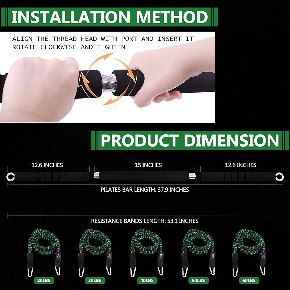توفير المساحة: مجموعات قضبان البيلاتيس مع أشرطة المقاومة سهلة التركيب والتفكيك. يمكنك تخزينها دون أن تشغل مساحة كبيرة. يتيح لك التصميم خفيف الوزن والمحمول ممارسة التمارين في المنزل والمكتب وما إلى ذلك. ويمكنك أيضًا أخذها أثناء السفر. ستحصلين على جسم مثير خلال نصف ساعة فقط يومياً.