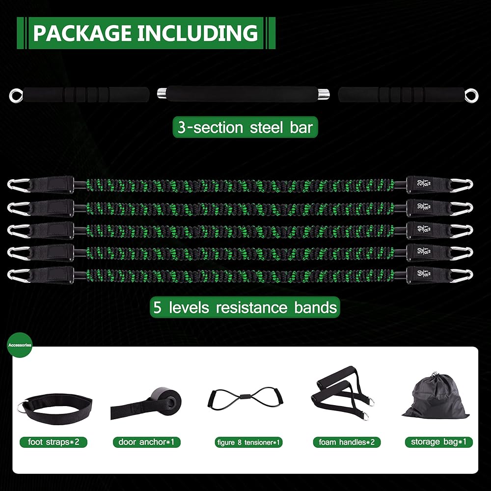 خدمة الرضا بنسبة 100%: نتأكد من حصولك على مجموعة قضبان البيلاتس التي تحتوي على 5 أشرطة مقاومة، ومقبضين من الفوم، ومرساة باب، وحزامين للكاحل، وقضيب فولاذي ثلاثي الأقسام، و1 شد و1 حقيبة تخزين. لا تتردد في الاتصال بنا إذا كانت لديك أي مشاكل أو أسئلة، ولدينا فريق دعم عملاء رائع بالكامل خلفك.