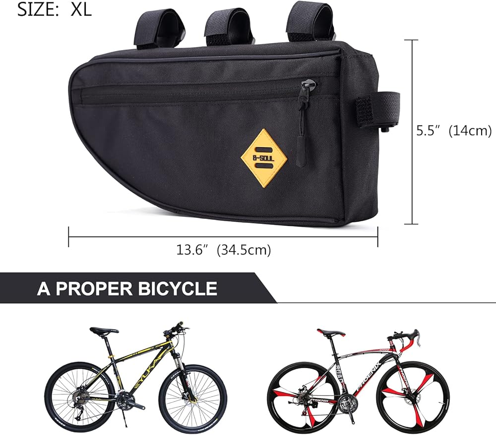 Reasonable size: choose the size that can be compatible with more bicycles, 34.5(13.6in)cm*14(5.5in)cm*5.5(2.1in)cm. The simple design can be installed on most bicycle beams.