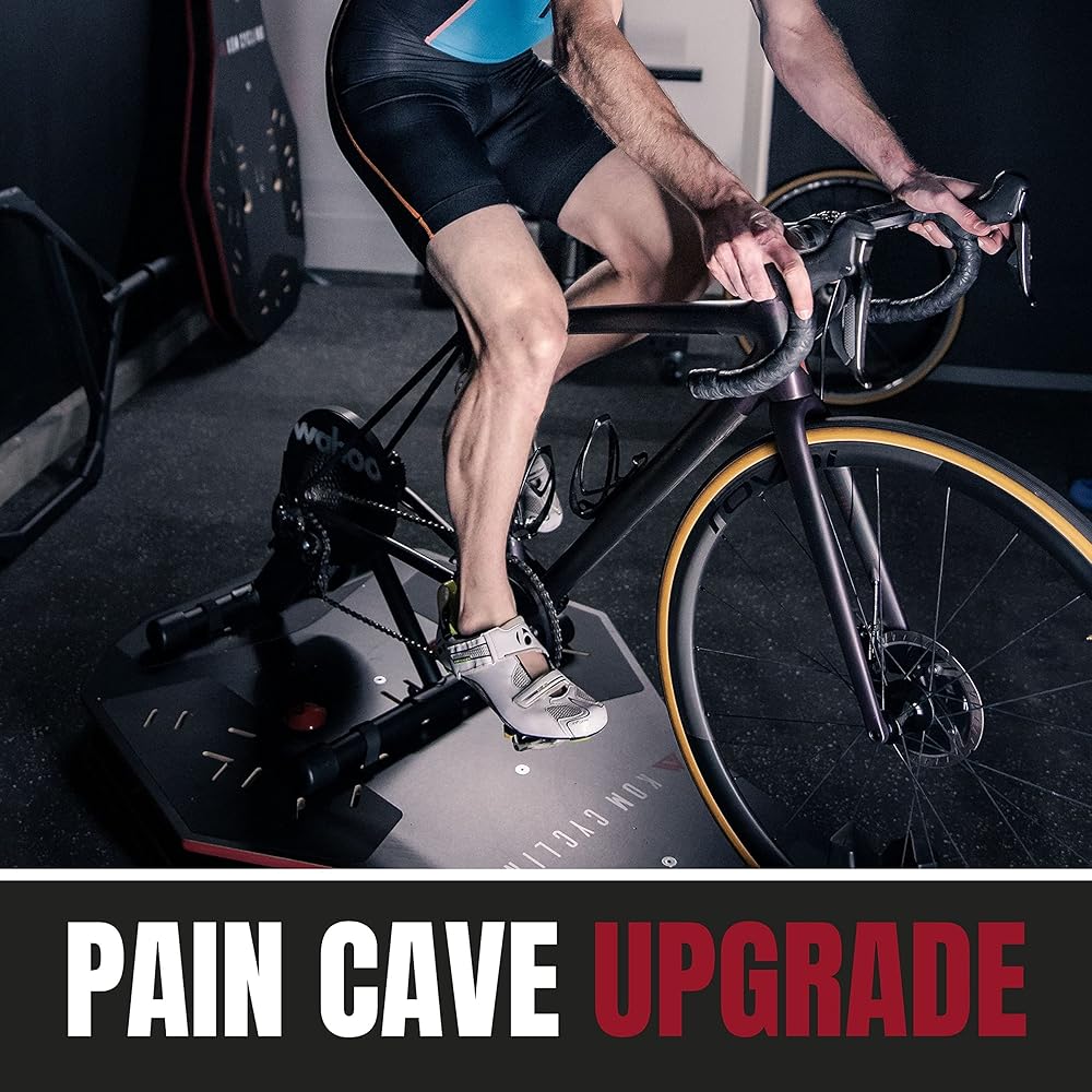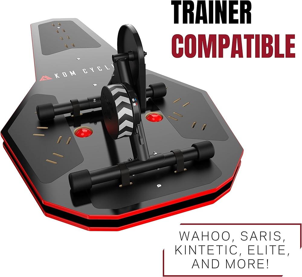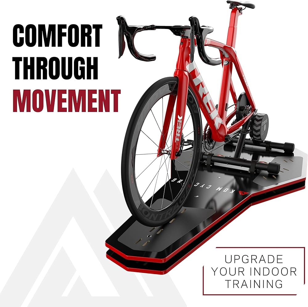 لوح هزاز لركوب الدراجات من KOM للتدريب الداخلي - يقلل من عدم الراحة، ويشغل القلب، ويركب لفترة أطول على Zwift. لوحة الروك تعمل مع مدربي Wahoo Kickr Core وTacX Neo 2T وSaris وغيرهم من المدربين!