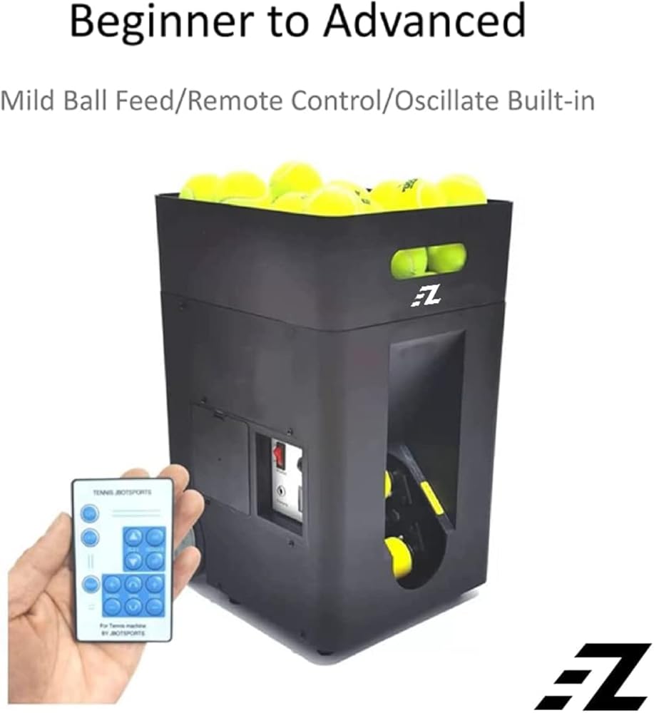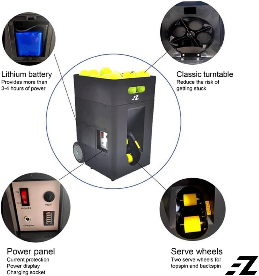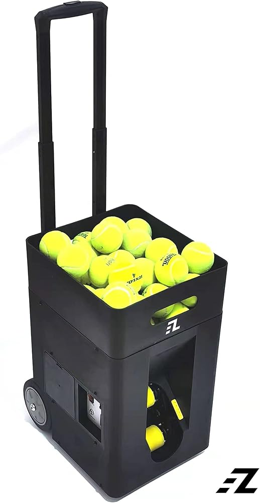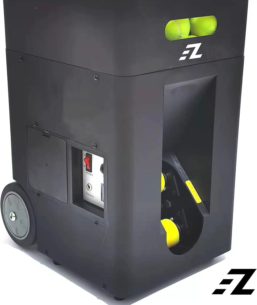 EZ Sports tennis ball machine. This is a great tennis machine for kids or beginners. It can help you to practice running left and right, forehand and backhand, lob, volley and can simulate most teaching scenarios. This machine is lightweight and easy to move around. Full function remote control, It is very easy to use. High Spin / Back Spin standard. Two moving wheels with pull handle for easy travel. Removable battery for charging. Battery and charger included Battery: Li-battery 24V5ah, Charger: 25.2V AC110-240V. The machine weighs 28lbs 13.5x12x20 Inches.