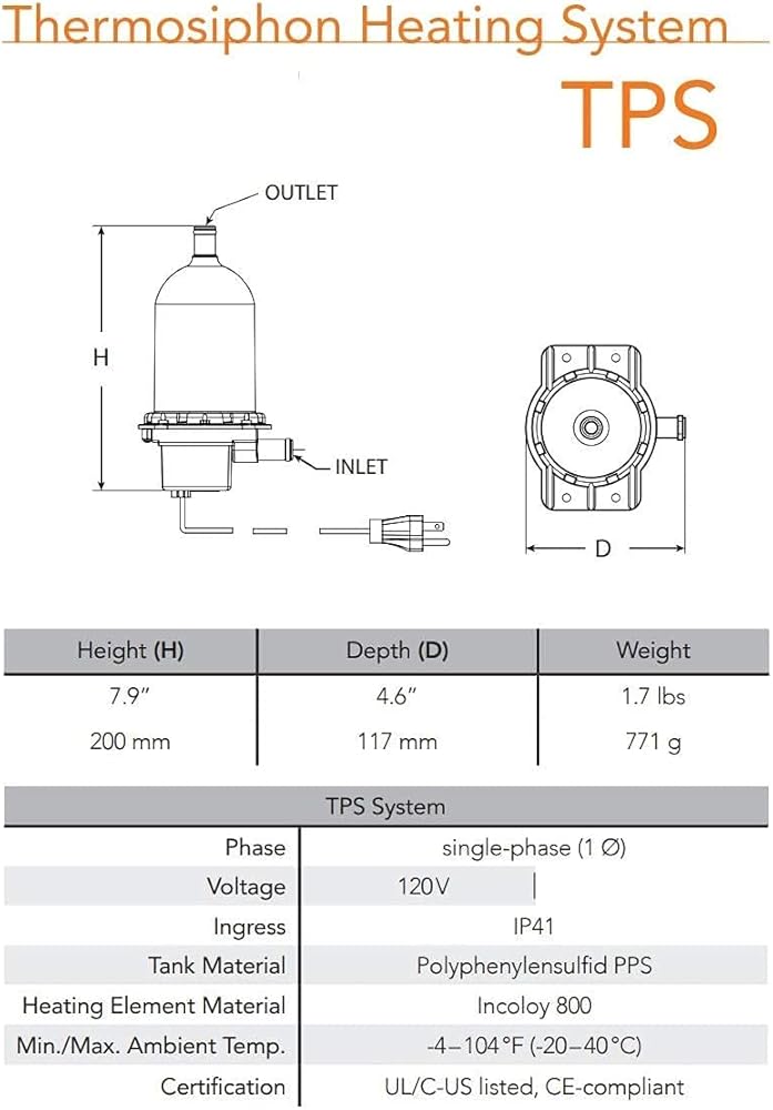 Pre-Heat: Diesel and Gas engines, construction equipment, trucks, marine and industrial applications Heating Fluid: Engine Coolant, Water, other No pump needed (thermosiphon principle) Engine Displacement: 500 – 700CID (8.2 – 11.5L) Volts: 240v – kW: 2 – AMPS: 8.3 – 60Hz Temperature Range: ON: 100°F (38°C) – OFF 120°F (49°C) HOTSTART TPS engine heaters provide even heat distribution resulting in reduced engine wear, quick start-ups and reduced emissions. The compact design is ideal for locations that require minimal mounting space. Specs: Heating Element: Incoloy 800 Enclosure: IP41 Resists corrosion Fluid Capacity: 0.11 gal (0.42 L) Maximum Pressure: 90 psi (620 kPa) Inlet/Outlet Plumbing: 0.625” (15.9 mm) Tank Material: Polyphenylensulfid PPS L-C/US listed CE compliant. Power cord length on all models – 48” (1219mm).