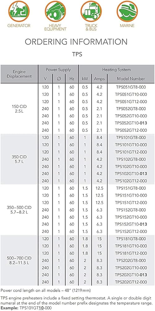 Pre-Heat: Diesel and Gas engines, construction equipment, trucks, marine and industrial applications