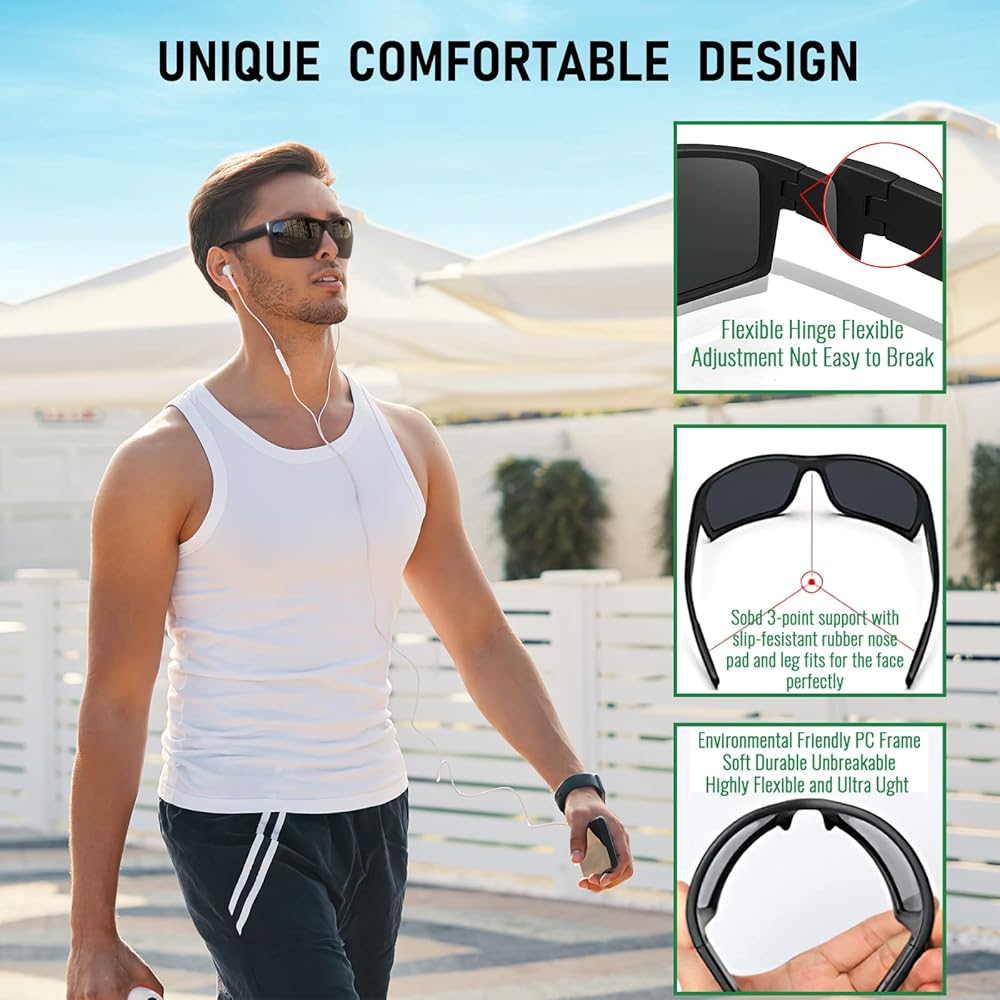 • [High Quality Frames]: The men's sports sunglasses frame made from high quality environmentally friendly PC, which is lighter, more flexible, and more durable than ordinary frames. The slip-resistant rubber nose pad is soft without oppression and can reduce the pressure on your nose, comfortable and lightweight to wear.